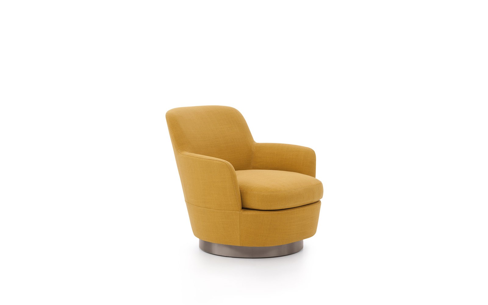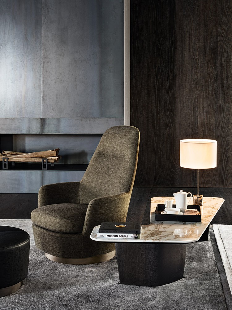 Thanks to its soft seat cushion and backrest padding, the Jacques bergère, available both with fixed and swivel base, with swivel base is extremely comfortable and lends itself to the creation of spaces where relaxation is key. When combined with its ottoman and the Song coffee table that embraces the armchair with its organic shape, it becomes a functional table-top surface for a lamp or to display various kinds of objects.