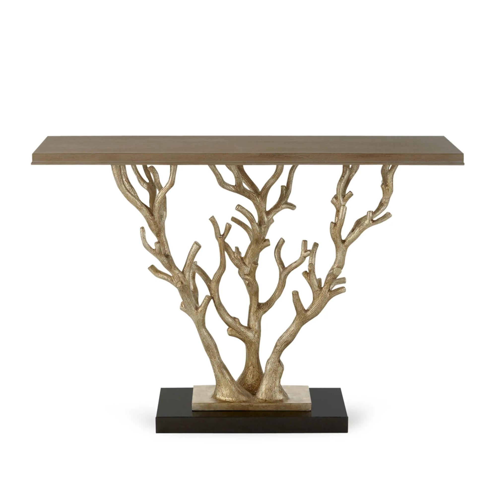 Ships from vendor.This tree branch inspired console features a small cast aluminum base finished with antiqued silver metal leaf and set on top of a larger black granite base. Top is American white oak in a ceruse finish.