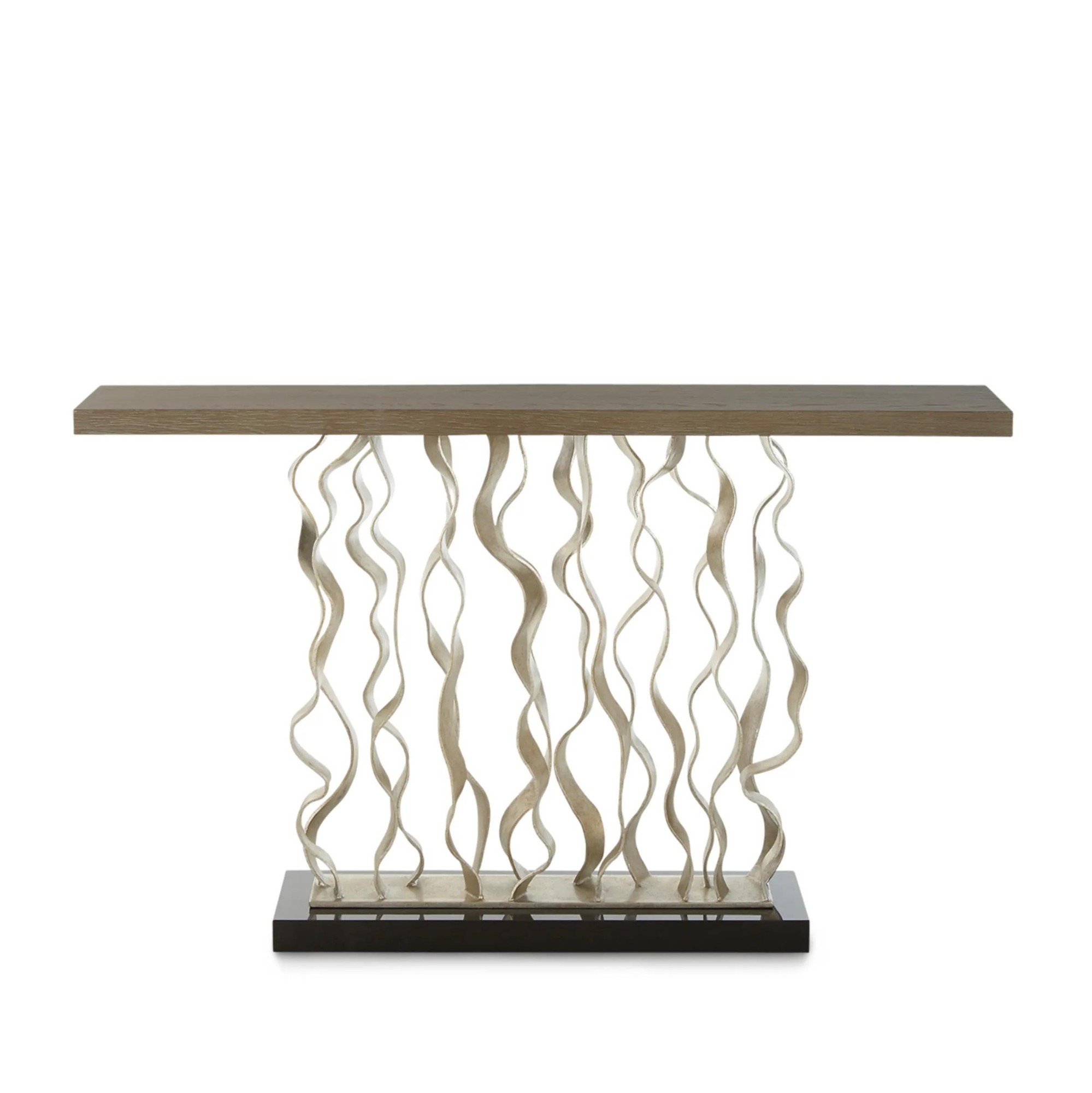 Handcrafted console table with metal wave base.