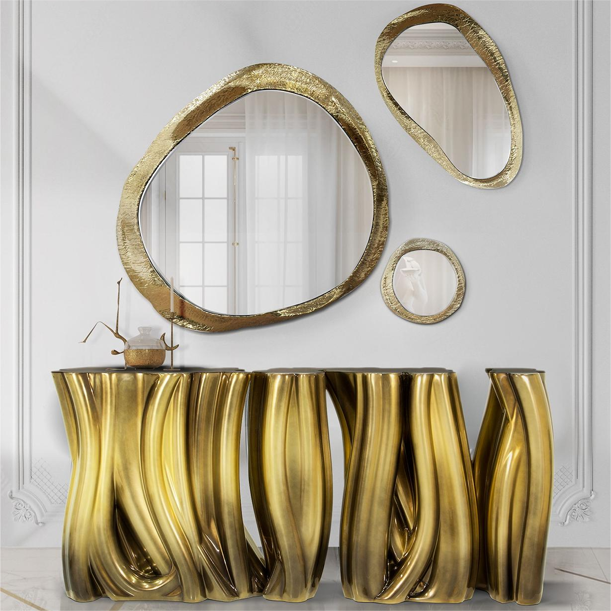 A demonstration of both imagination and strong design skills, the Monochrome console is a remarkable piece that stands out in any room or setting. Perfect for living spaces grounded in contemporary style as they embrace careful craftsmanship, this console expresses a leading edge outlook through its daring curvy shapes and gold tones.