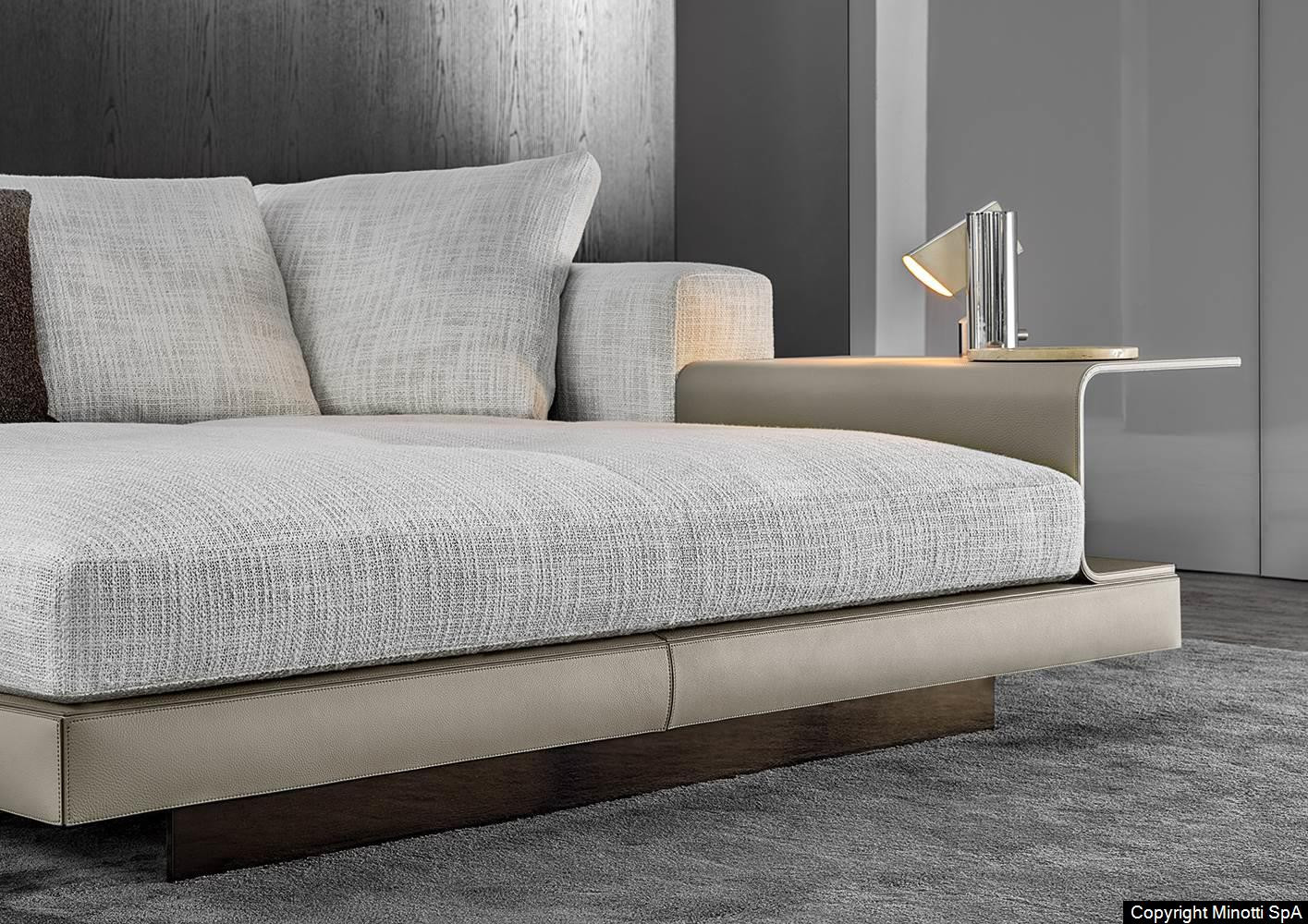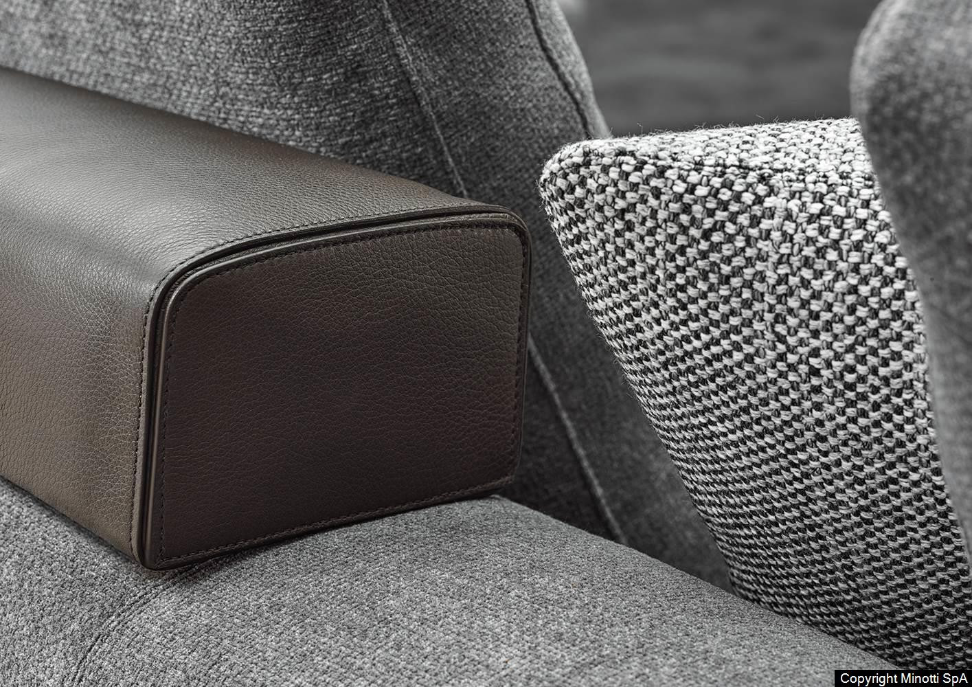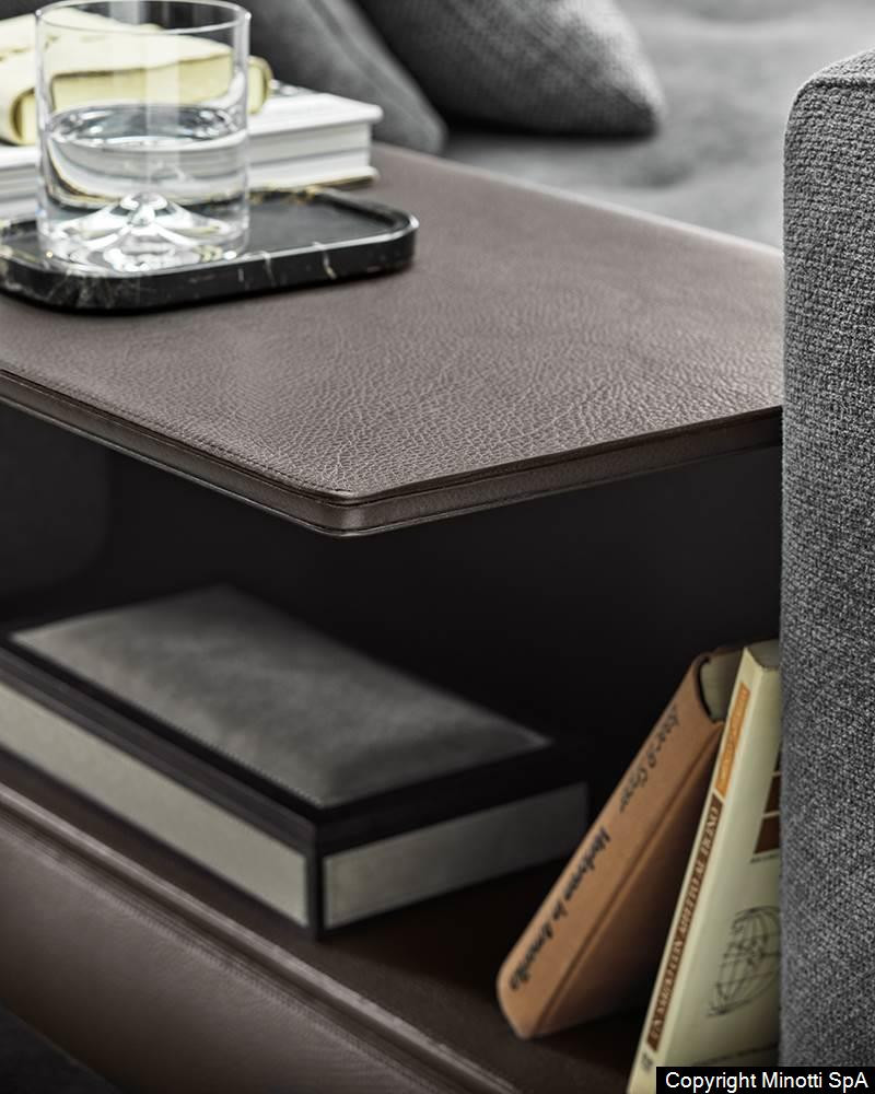 As well as the fabric covering, the padded structural base can also feature a covering with strips of leather, crafted with the same technique used in fine leather luggage-crafting. References to the concept of high-end leather goods are also found in the headrests and the elegant “C”-shaped Flap surfaces, which seamlessly blend into the seating elements, animating the compositions with a vibrant rhythm.