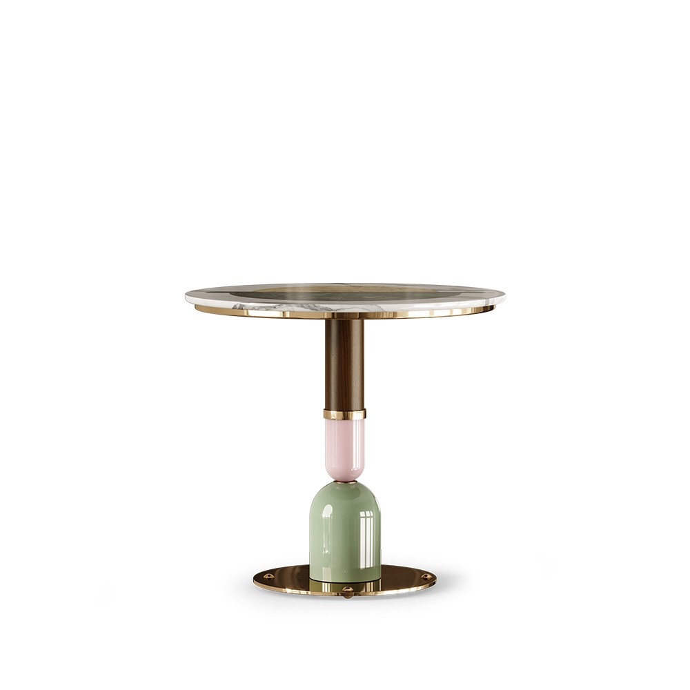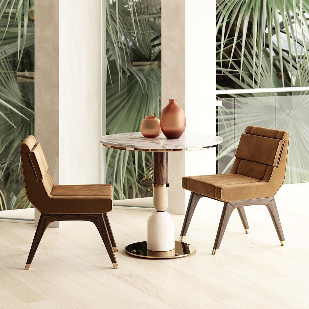 Materials and Finishes: Matte Walnut Wood, Glossy Lacquered Wood, Carrara Marble and Gold Plated Brass