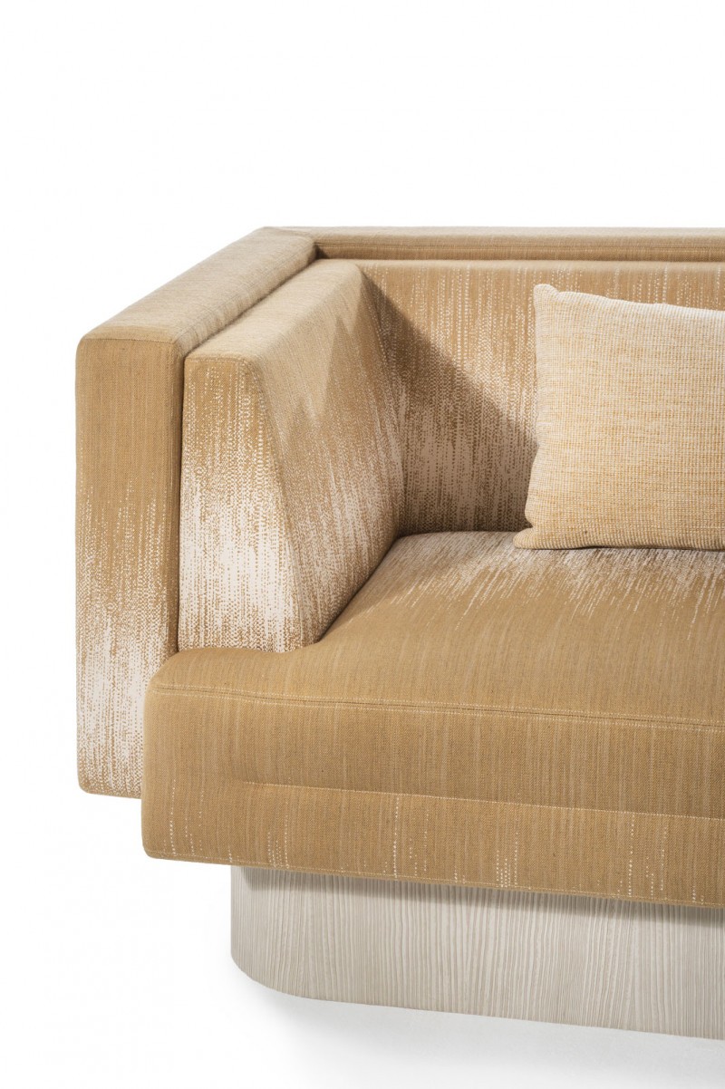 A very structured shape, but which in no way contradicts the softness of the seat and backrest; a majestic double base in sanded pine, which accentuates the lightness; a play on asymmetry, with a single armrest, and a "platform" suspended at the other end. All these features make the Nashville canapé a piece as spectacular as it is daring. Its upholstery, a subtly streaked jacquard (like its base), combining several shades of pale gold, as if aged, patinated by time and the sun, accentuates its very glamorous side.