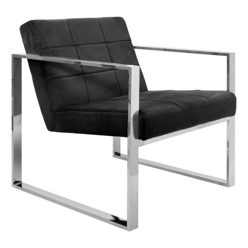 The chair is designed to add a touch of vintage glamour to the living room. The chair's frame is made from polished stainless steel and has a simple square design that provides a platform for the pastel pink/black/blue seat. The wide seat is upholstered with luxurious velvet and has a tufted grid finish. The frame is angled at the base allows the seat to attain a slightly reclined position.
