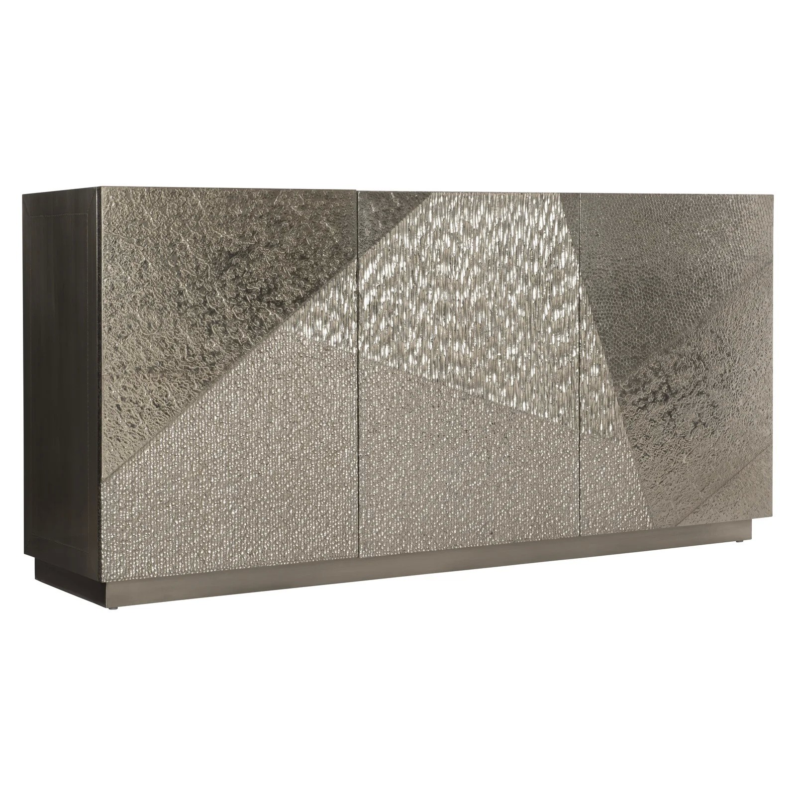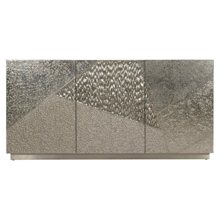 The Gatlin buffet offers style, storage, and textural sophistication in one design. Featuring four distinct patterns, the three doors are clad in gleaming German silver. Open them to reveal an interior that includes two soft-close drawers, compartments, and shelves, one of which is adjustable, to accommodate a wide variety of storage needs.