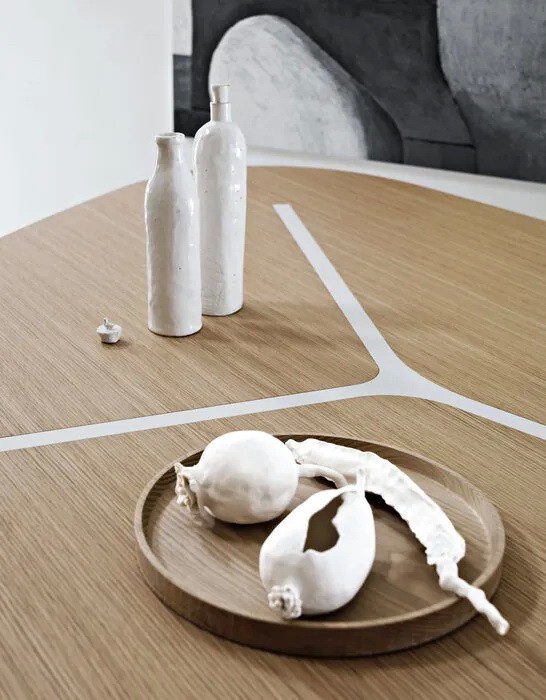 Three uneven sides are an alternative to the traditional layout. Designed to seat 7, in the formation 3+2+2. The appearance changes depending on the wood or lacquer finish but the pattern of the three-branch structure emerges on the top’s surface creating a graphic decoration to contrast with or match the colour of the top.