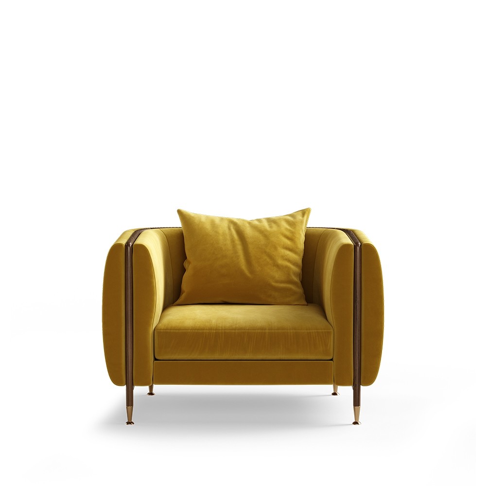 The Barlow armchair is a handmade upholstery piece with a textured fabric. The curved lines bend the legs in all its strength gracefully accentuated by rich polished brass details. The medley between the materials takes this sofa to a higher level.