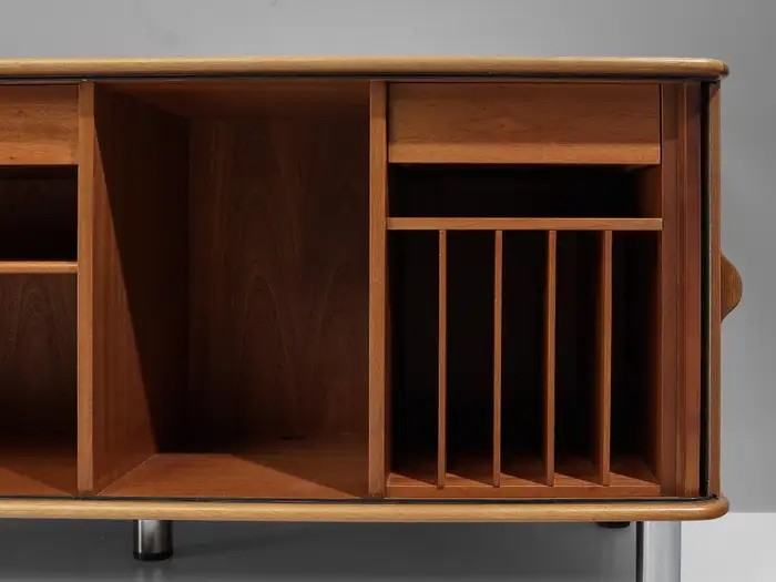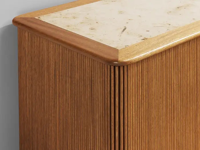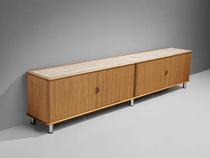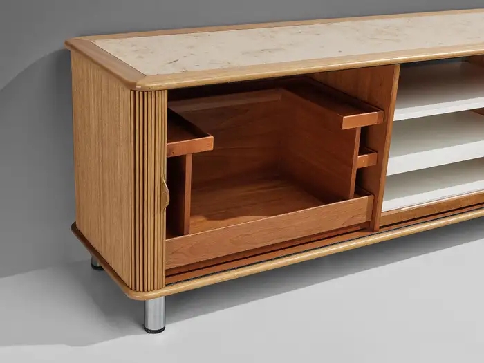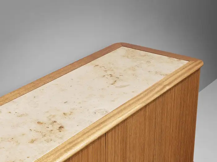 The sideboard features sliding-tambour doors which hold a lovely vertical, rhythmic pattern. In addition, the top is inlayed with a creme-colored fossil marble. What makes this so special and one of a kind, is the presence of real preserved imprints of nature. The present spiral fossil, called Ammonite, originates from squid species that went extinct about 65 million years ago. Upon accessing the interior of the cabinet, one discovers a sophisticated storage arrangement consisting of drawers, shelves, and record holders. In all, this rare cabinet exemplifies the duo's exceptional talent and remarkable ability to create furniture that combines functionality with an aesthetically pleasing layout.