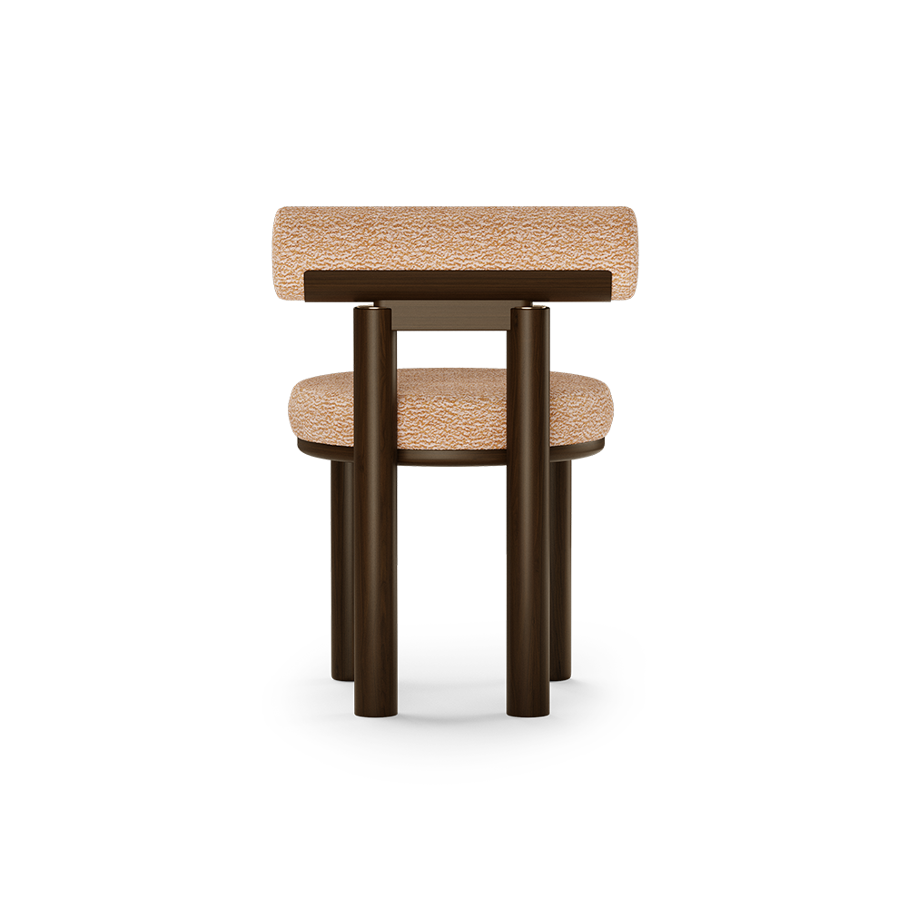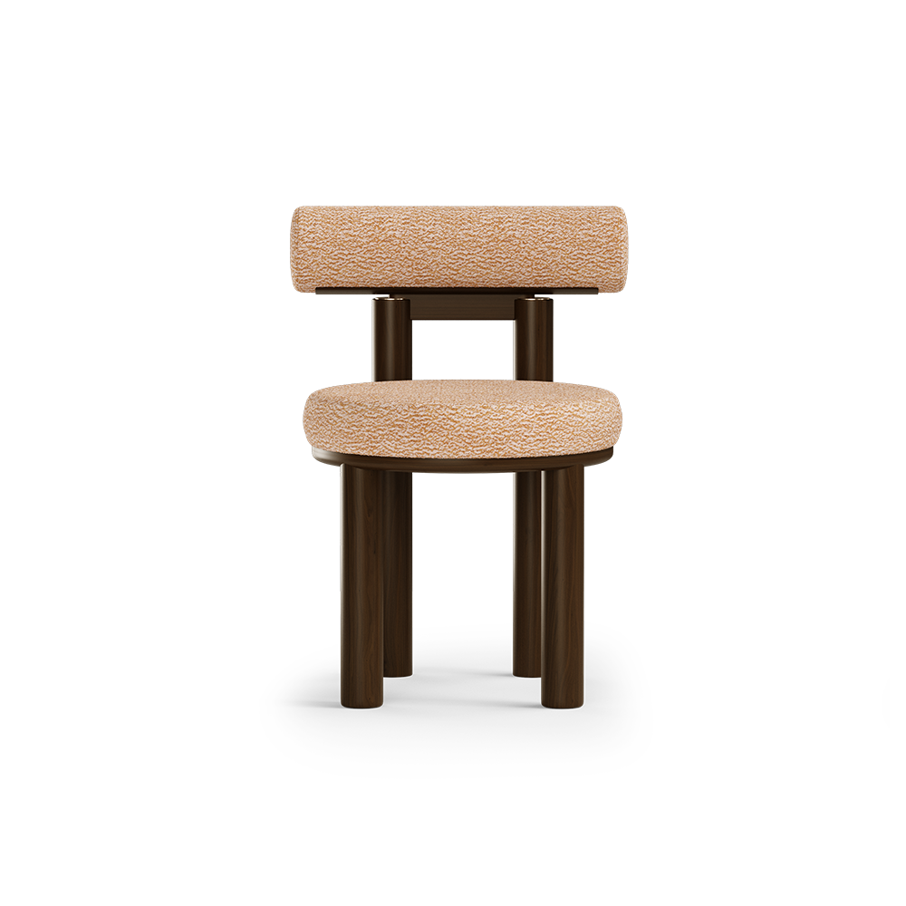 The dining chair represents the influence of curves, patterns and colors in mid-century movement. Made in walnut wood and upholstered with a geometric fabric this unique dining chair has purpose to invoke and provoke. Is the perfect piece to add a modern mid-century twist to your interior living room project.