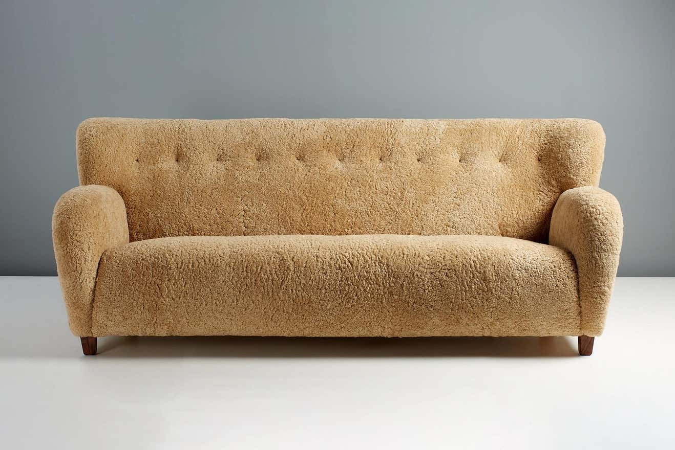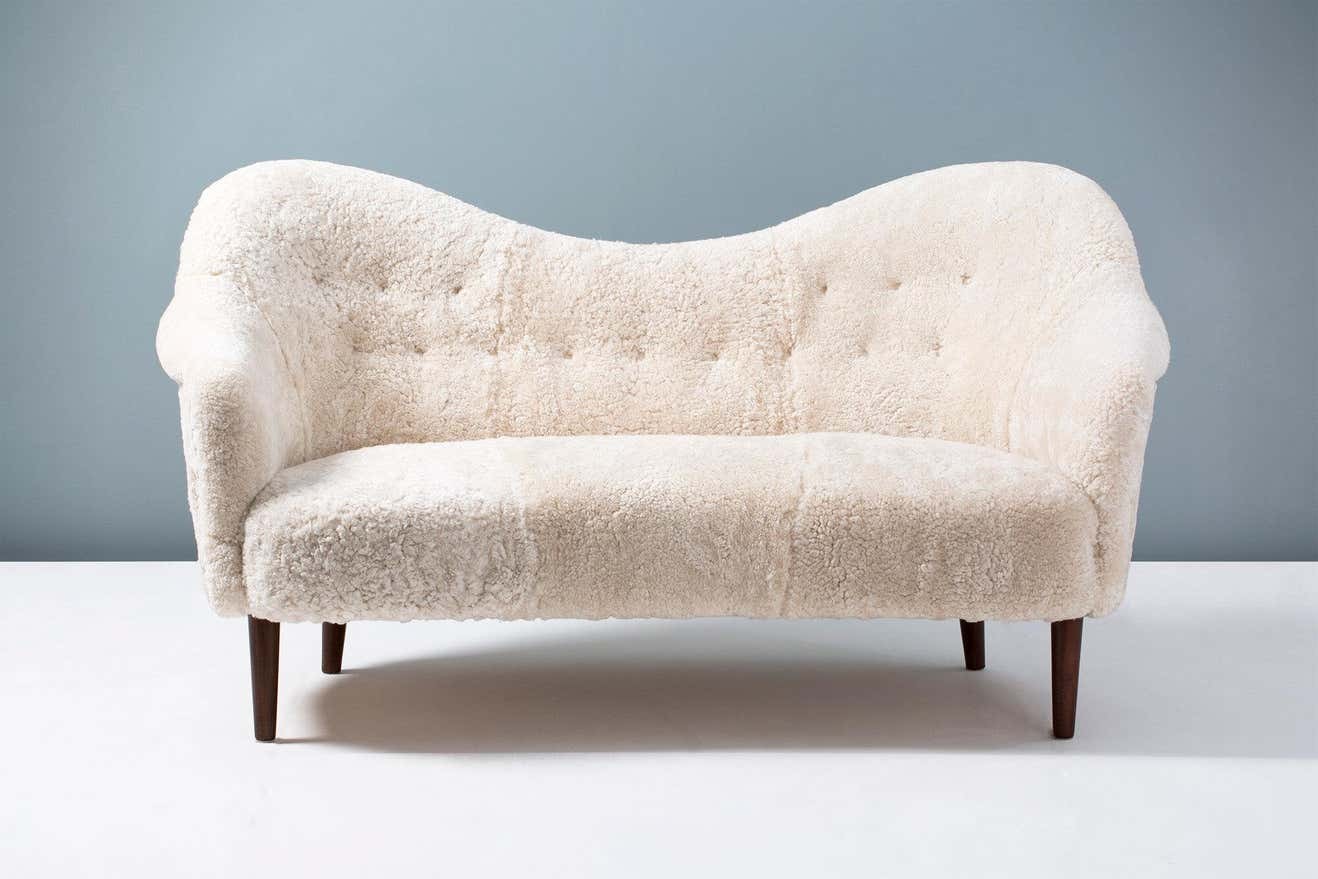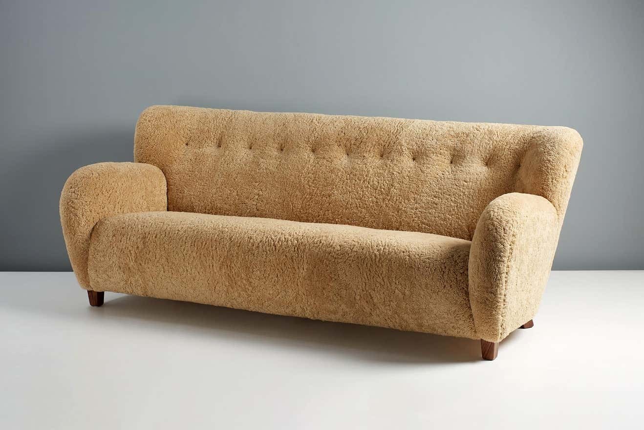 The sofa legs are available in oiled oak, dark fumed oak, oiled walnut (as shown) or dark stained beech. The frame is made entirely of solid English beech and the seat and back are fully sprung to ensure maximum comfort. These sofas are upholstered in luxurious shearling from New Zealand available in your choice 5 different colours. Other upholstery options are also available by request including Mohair velvet and boucle fabric.