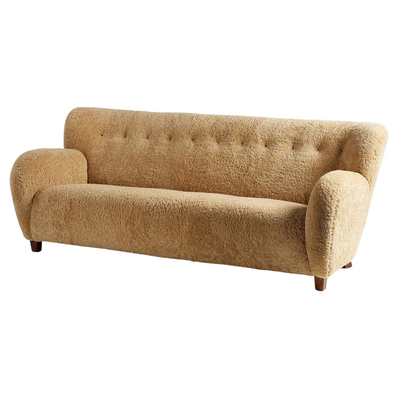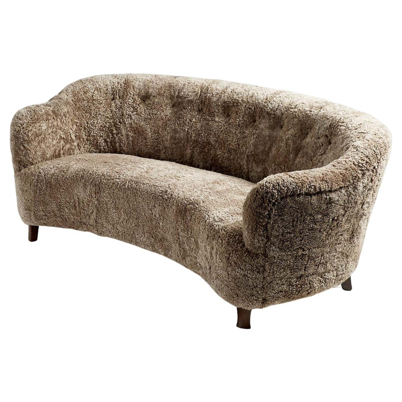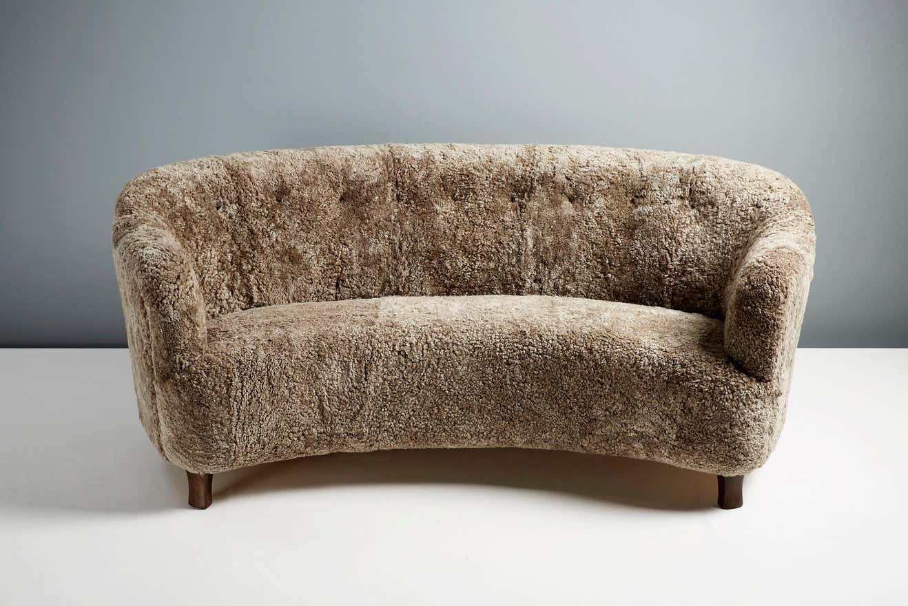 The sofa legs are available in oiled oak, dark fumed oak, oiled walnut (as shown) or dark stained beech. The frame is made entirely of solid English beech and the seat and back are fully sprung to ensure maximum comfort. These sofas are upholstered in luxurious shearling from New Zealand available in your choice 5 different colours. Other upholstery options are also available by request including Mohair velvet and boucle fabric.