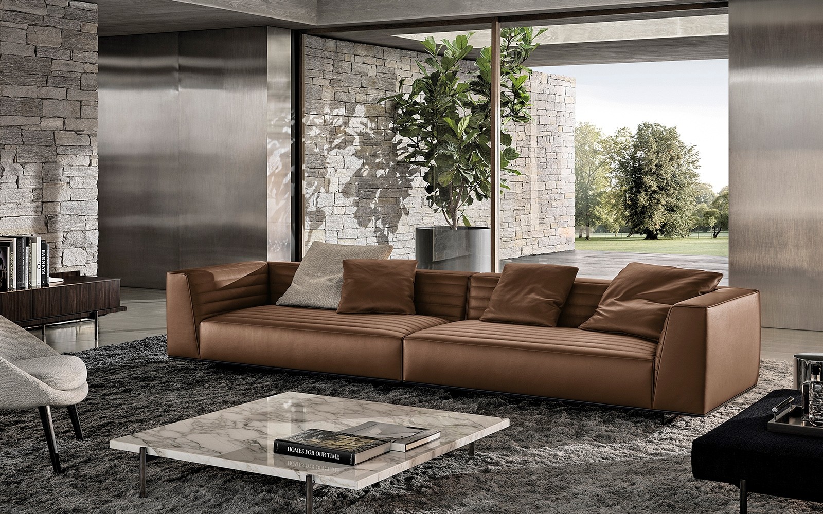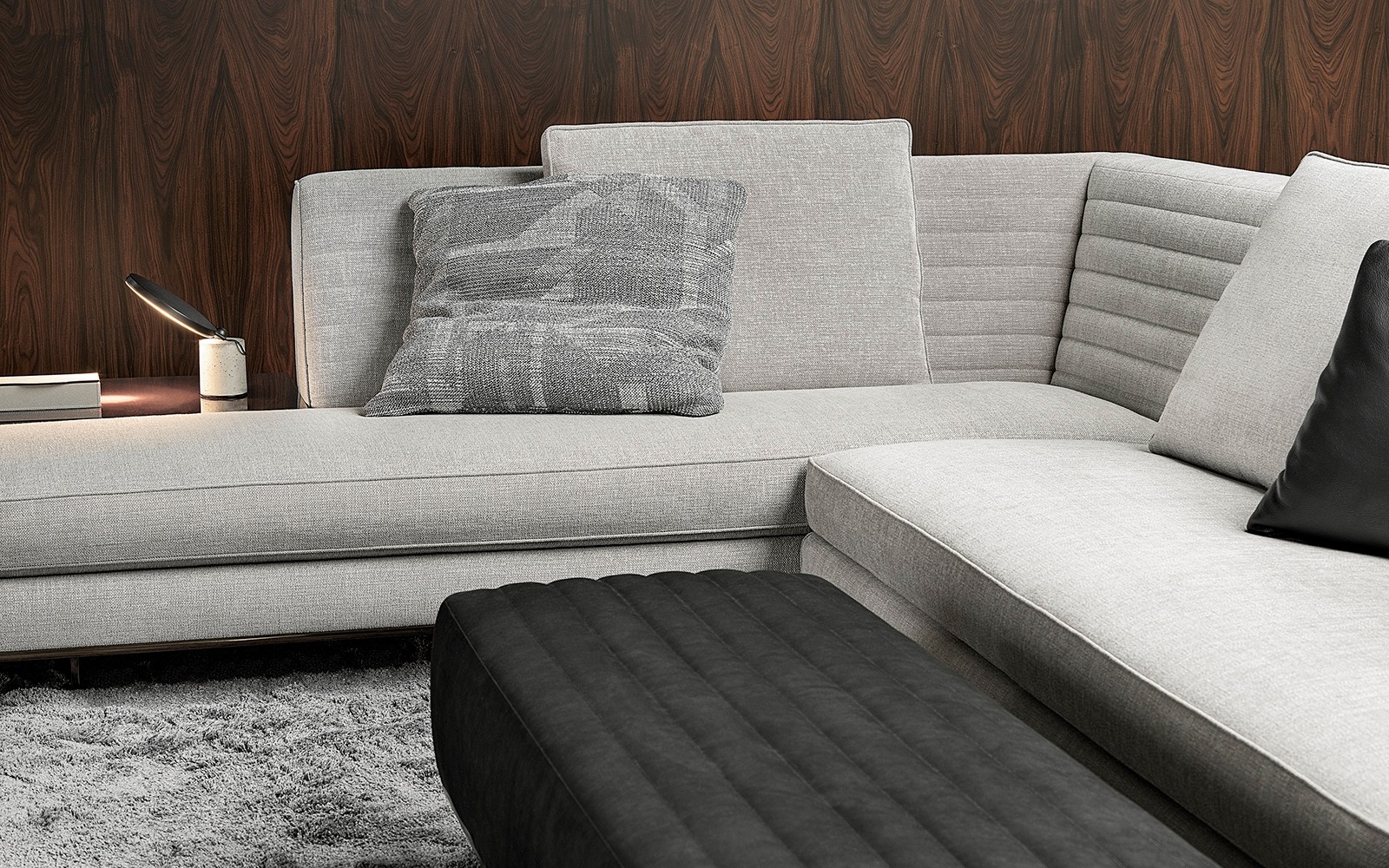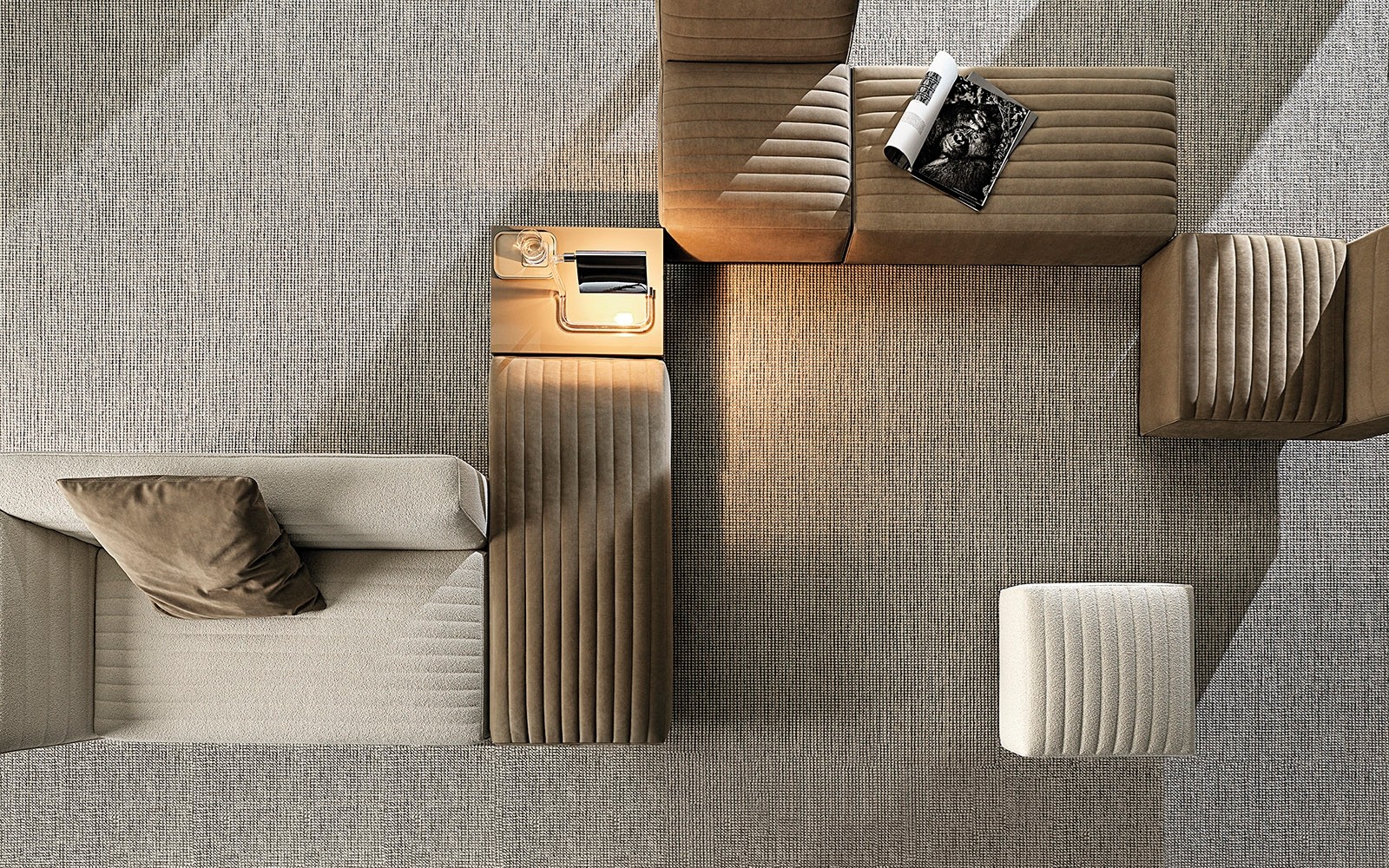 The couture-like skills used in the crafting process are expressed in the graphic quilting effect, sporting long horizontal lines that run along the backrests, the seating elements and the matching benches, endowing the surfaces with a super soft, luxurious feel.