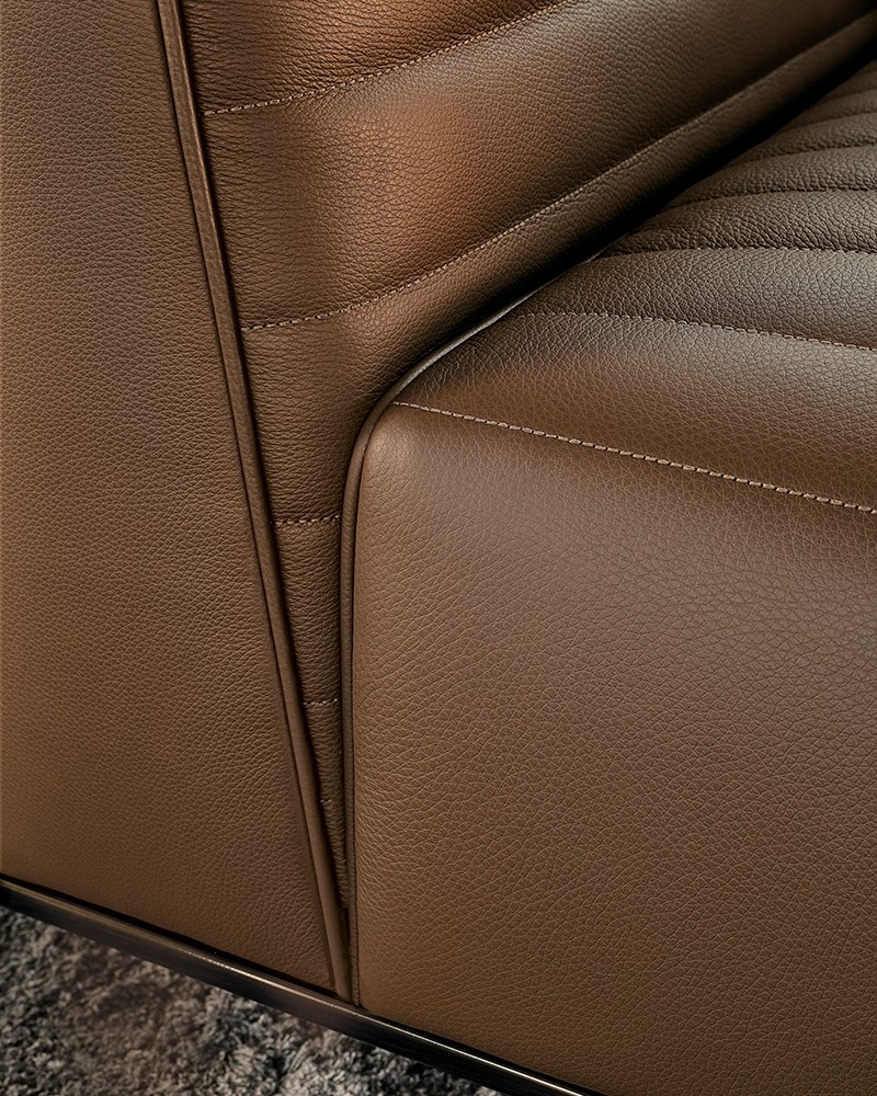Extruded aluminium perimeter frame with cast aluminium joint fittings, varnished polished anti-fingerprint Black Coffee colour. Rests on weight-bearing blades in extruded aluminium, varnished polished anti-fingerprint Black Coffee colour. Oil-free, non-staining polyethylene glides. Before removing the upholstery, unscrew the various parts (armrests and backrests) from the base.