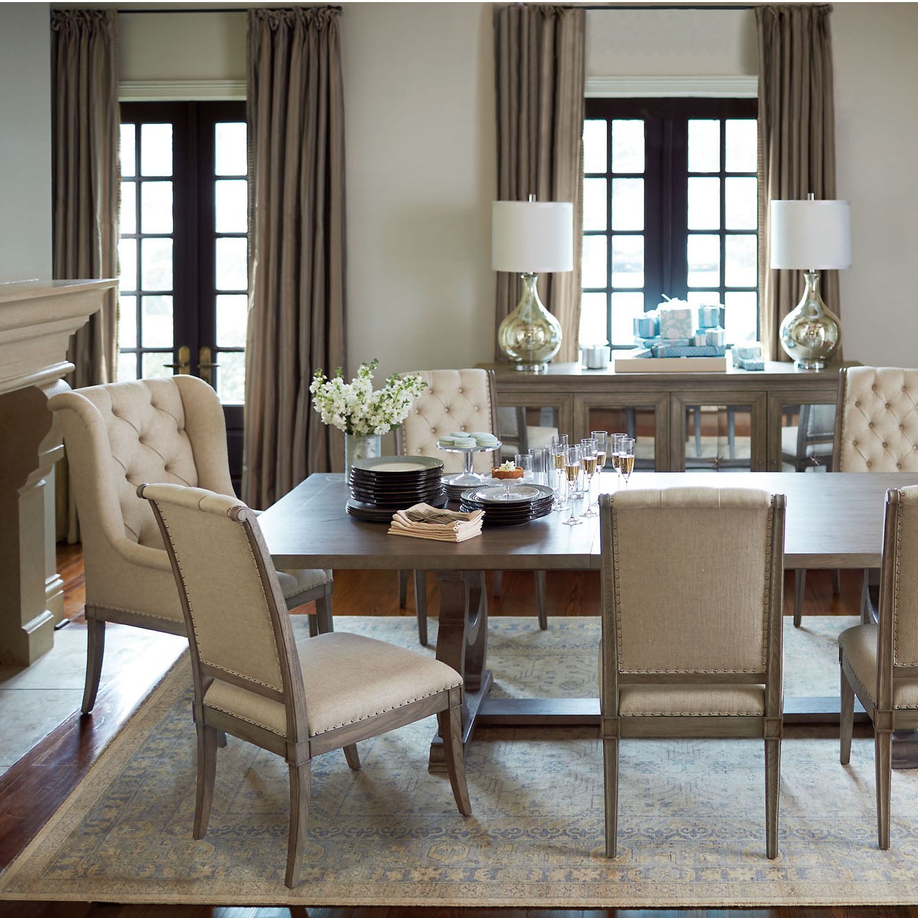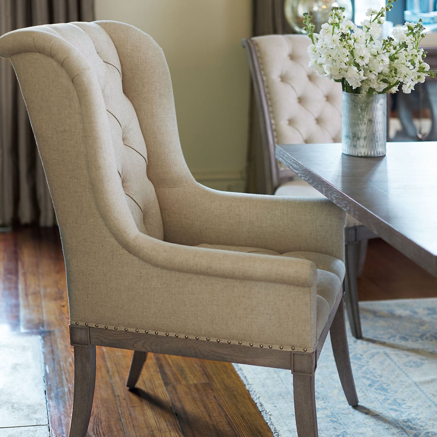 The timeless host dining chair is worthy of its place at the head of the table, seamlessly blending luxury with comfort. With a nod to the traditional wing chair but modern in feel, this charming chair is fully upholstered with a button-tufted back and exposed seat rail and legs. Its timeless quality of style has an enduring appeal.