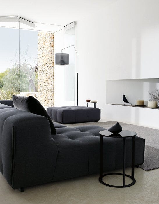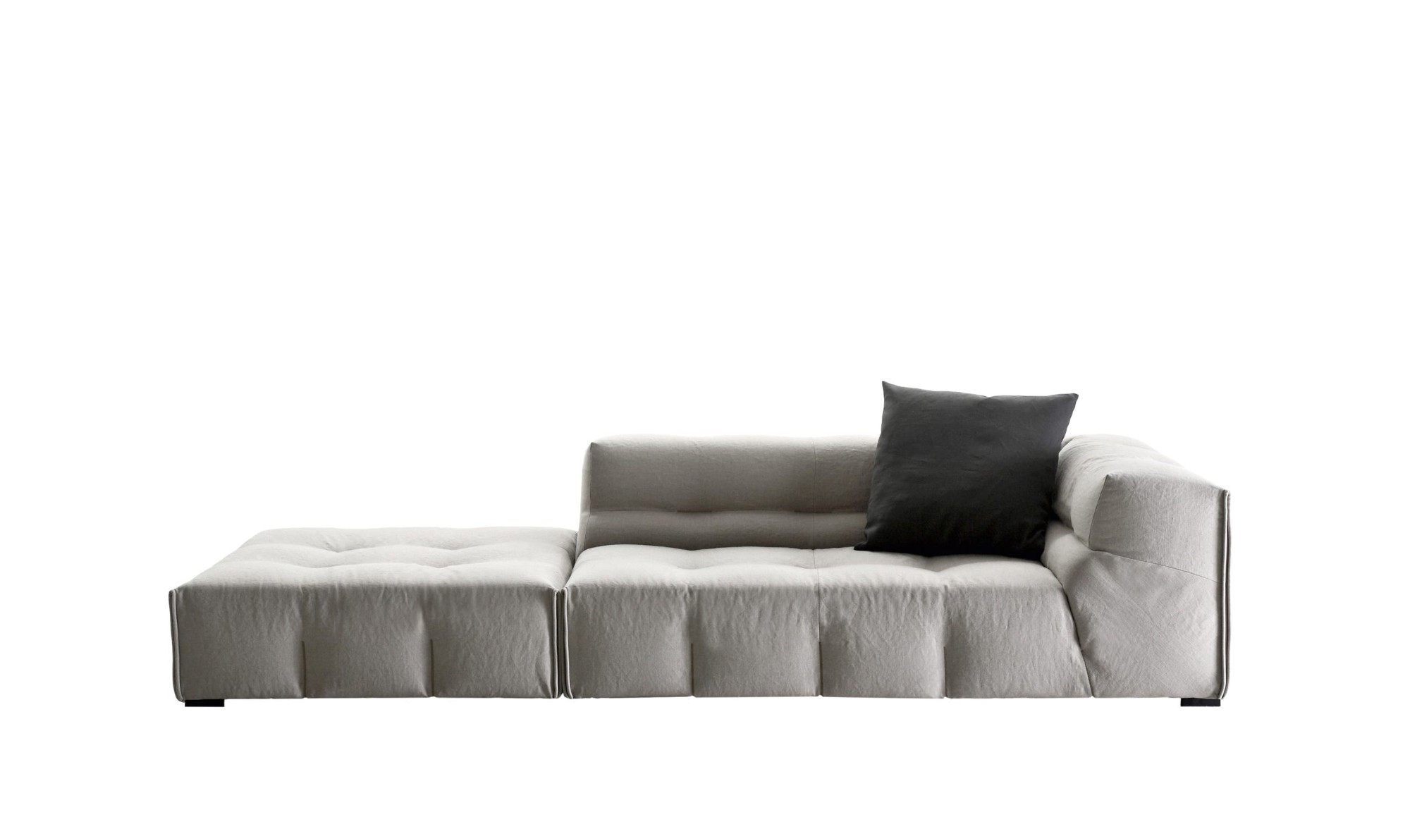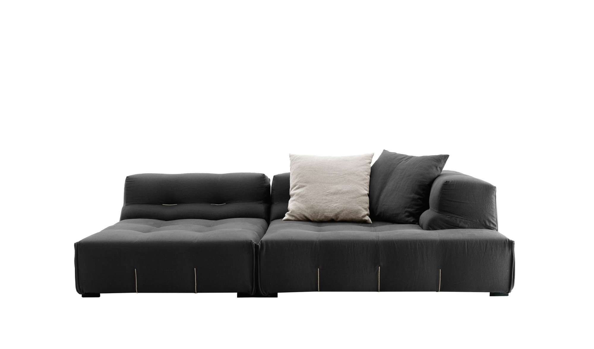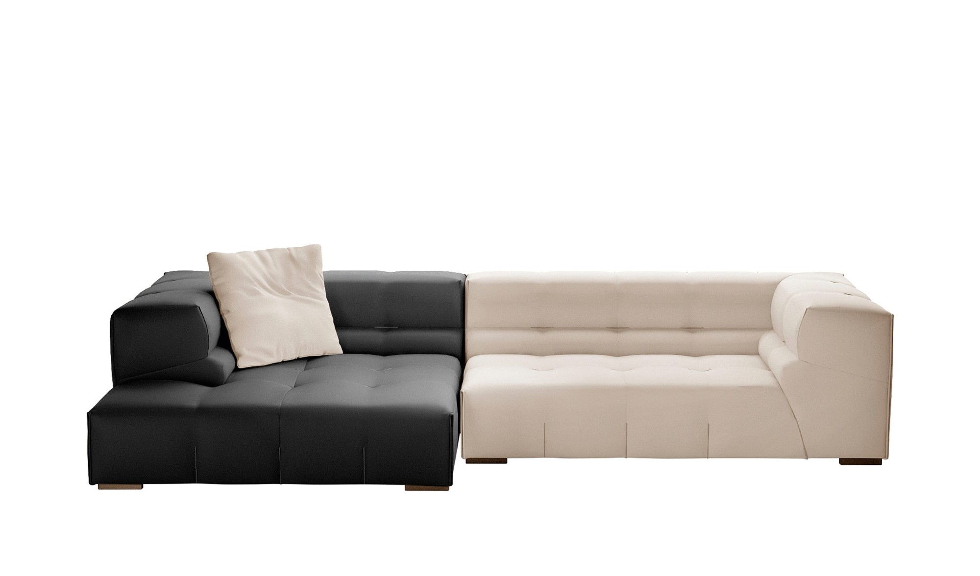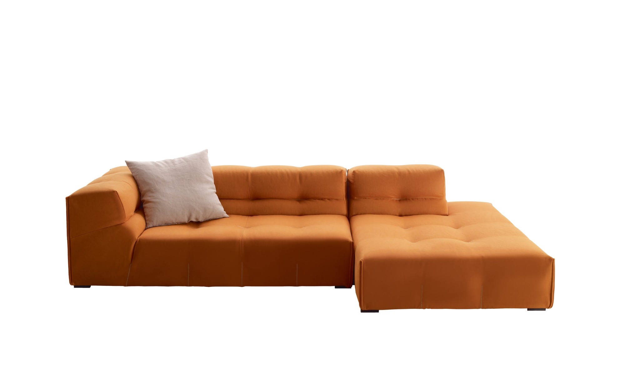 In fabric or leather - stands out for a perceptible feeling of softness along with a decorative quality based on a high-quality tailoring finish. This contemporary proposal makes reference to the '60s and' 70s: the citation of the style lies in the matching or contrasting hues of the cover seams, which become a distinctive feature. The entire line is marked by exceptional modularity and absolute compositional freedom. Numerous elements make up the system, starting with an ottoman as the basic piece, which is then accompanied by central, corner and terminal elements with a low or high armrest. These elements are used to invent traditional sofas, sofas with chaise longue, corner sofas and island elements that provide a 360° seating solution.