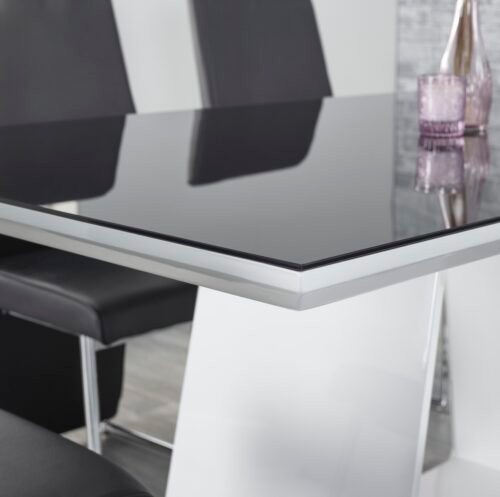 This beautifully contemporary dining set comprises of a high gloss white table finished with an elegant black glass top. 6 Stunning black faux leather and chrome chairs complete this set.
