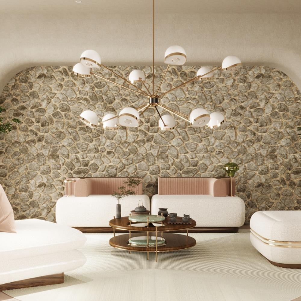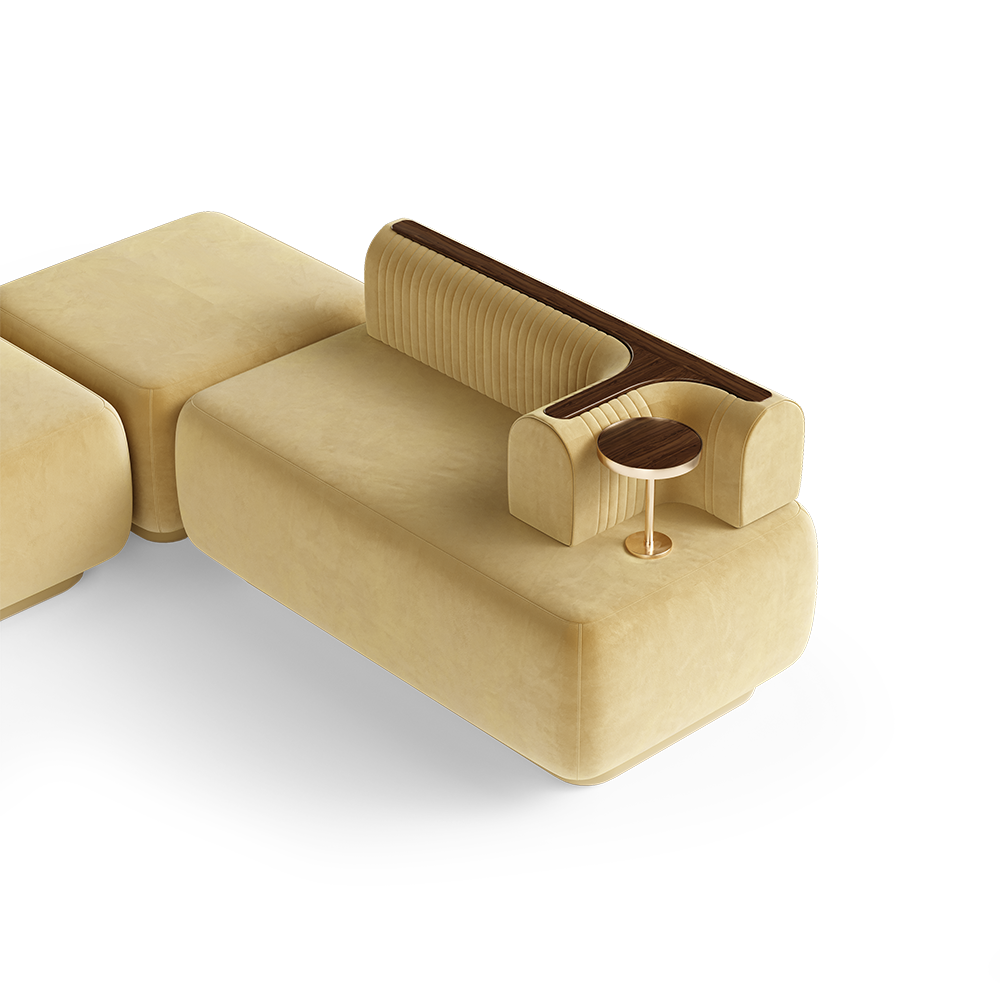 Lauren Sofa is the perfect complement for a bar. Drawing inspiration from the aesthetics of mid-century modern design this sofa has a small table on the side, made with polished brass, to handle cups of drinks. The backrest with details in matte walnut wood gives consistency to his structure.