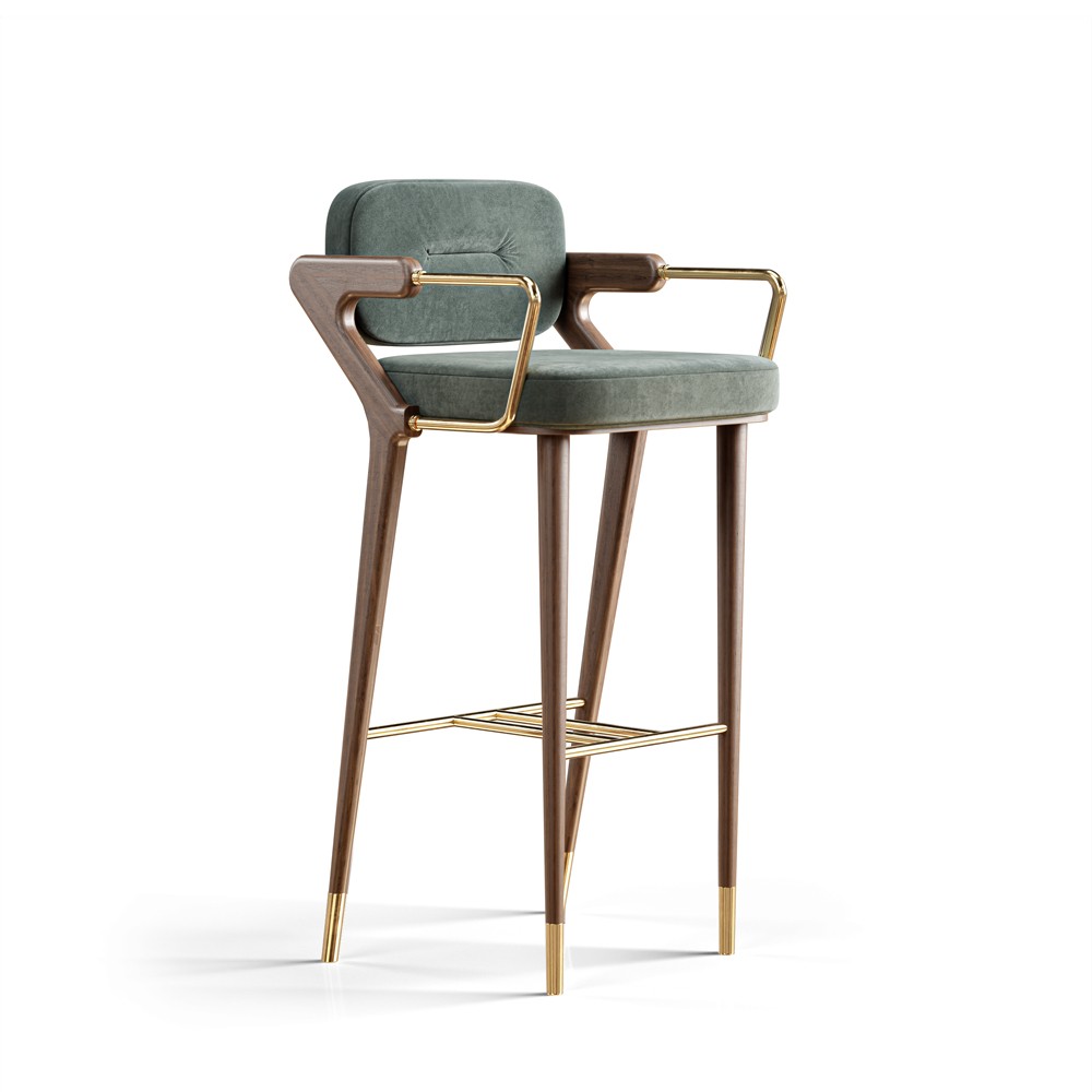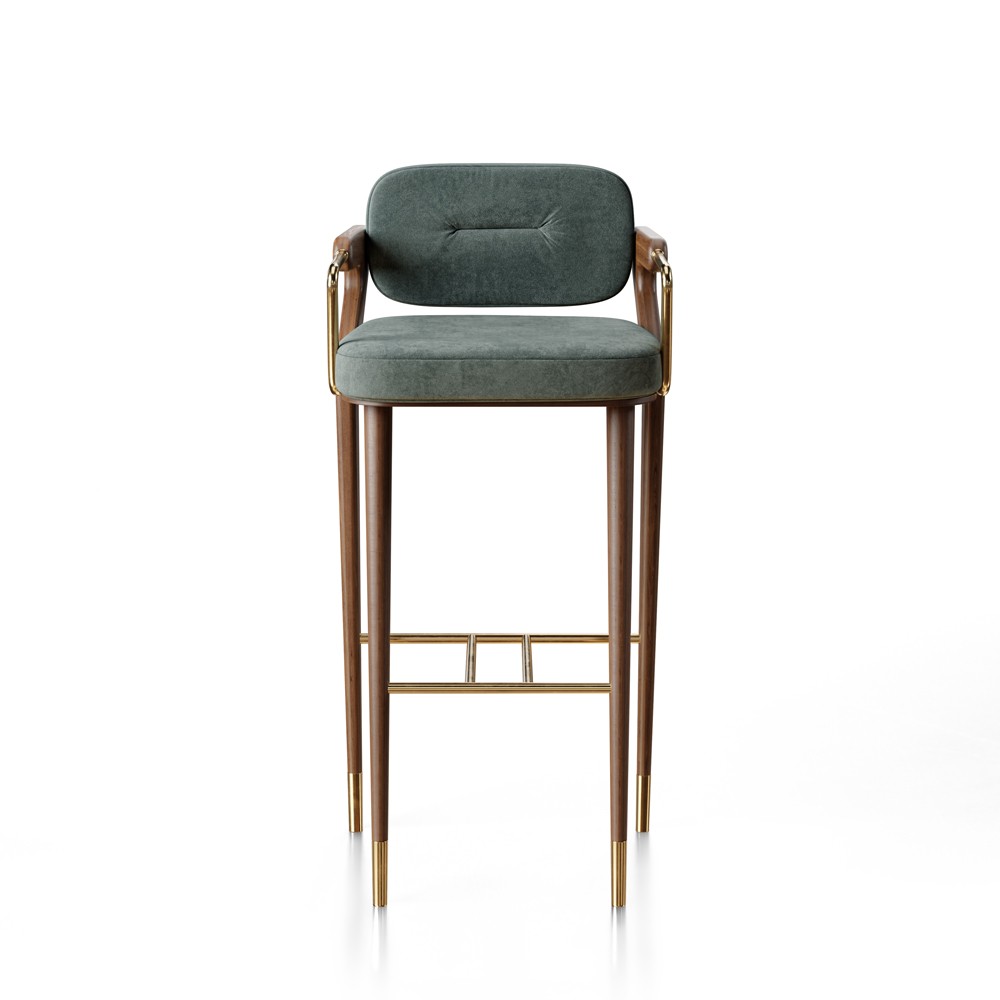 The Zimbro Bar Chair has a mixed design. The upholstered seat and back are meant to evoke art deco and vintage bars, while the rest of the chair exudes a contemporary aesthetic. This chair is the perfect outstanding piece for any bar.