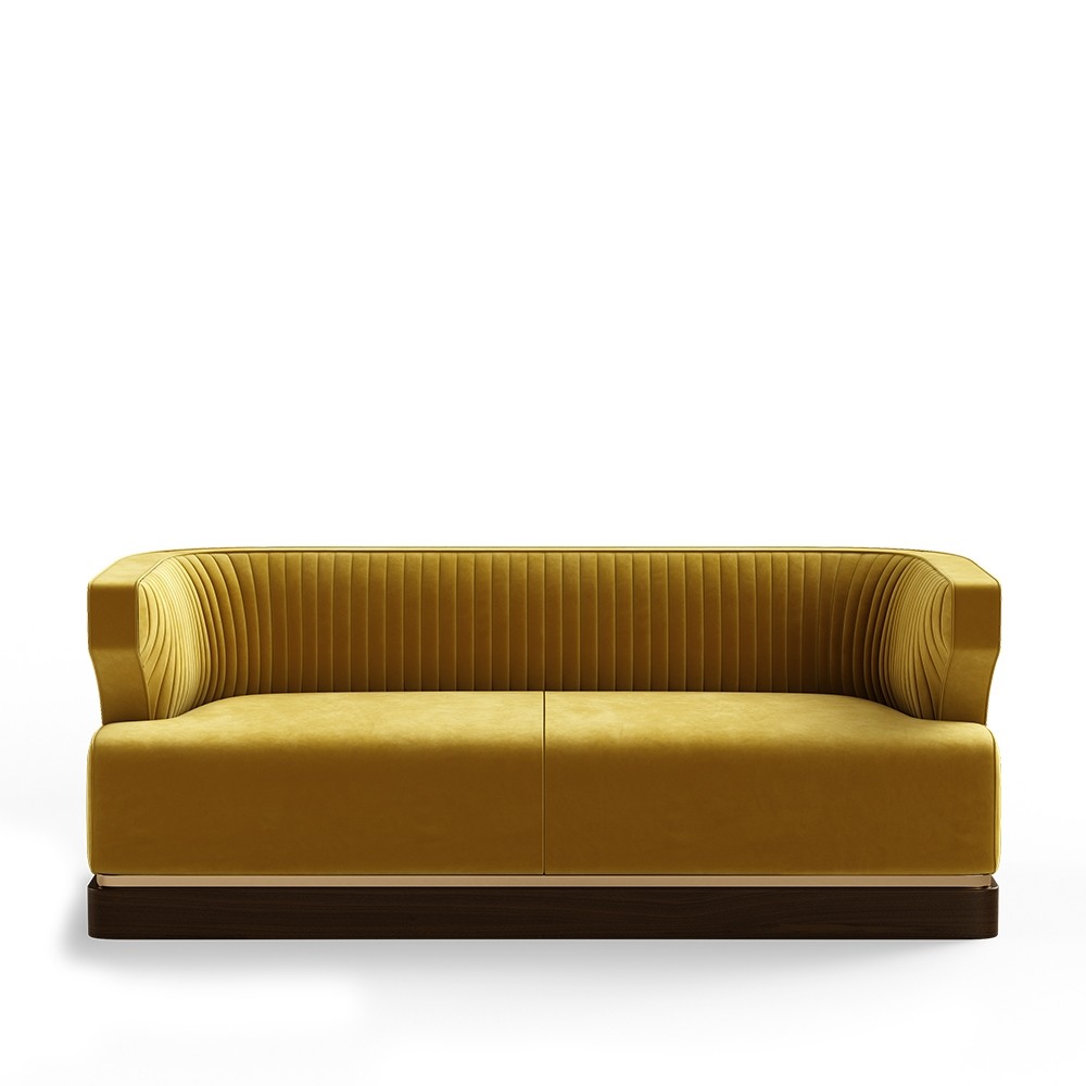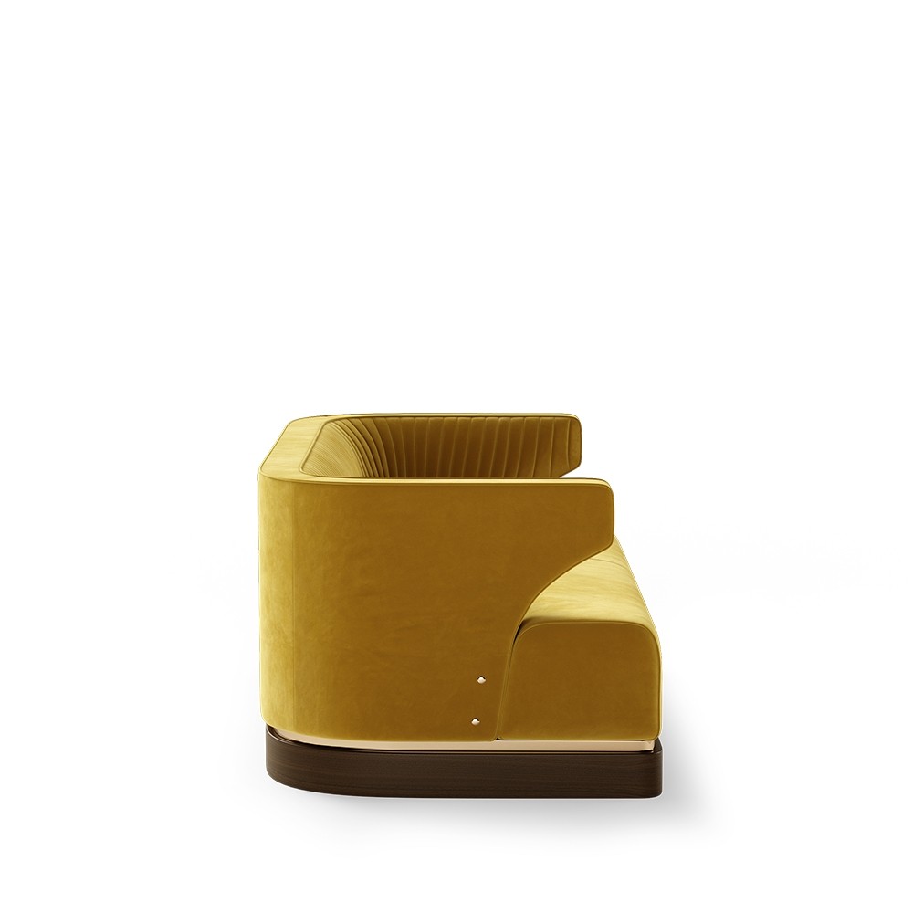 Inspired by the well-known American jazz saxophonist Gene Ammons, the Ammons sofa seeks to convey boldness and luxury through the polished brass details and the soft colorful fabric. It intends to give a fresh aura to any design, and its strong shape is what makes it so unique.
