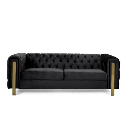 Transform your living room space with a striking centerpiece of absolute sophistication that will bring out the best of your interior decor. Our elegant modern glam three-seater sofa is the ideal addition to any interior space with its smooth velvet upholstery, deep button tufting, and stunning diamond stitching. Featuring a beautiful tuxedo arm design and outstanding gold accents, this impressive sofa acts as a streamlined statement piece that can change the whole flow of your living room with style and comfort.