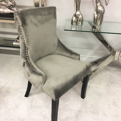 This beautiful and luxurious upholstered dining chair has a soft faux grey velvet fabric and finished with silver studs and buttoned back.
