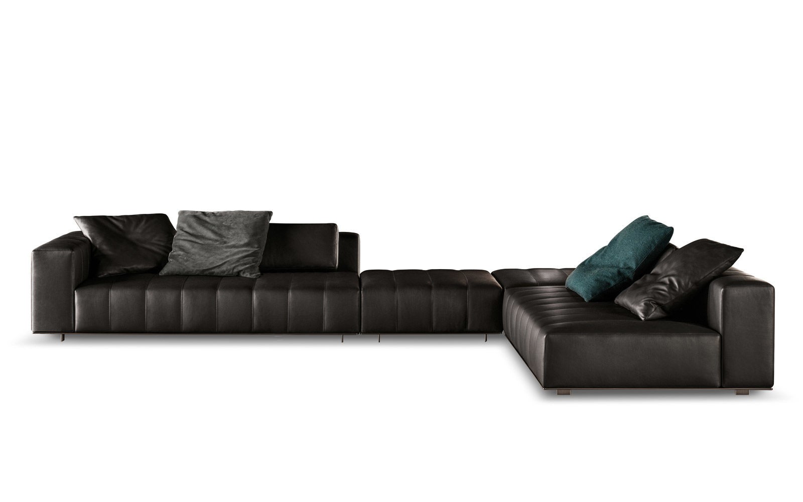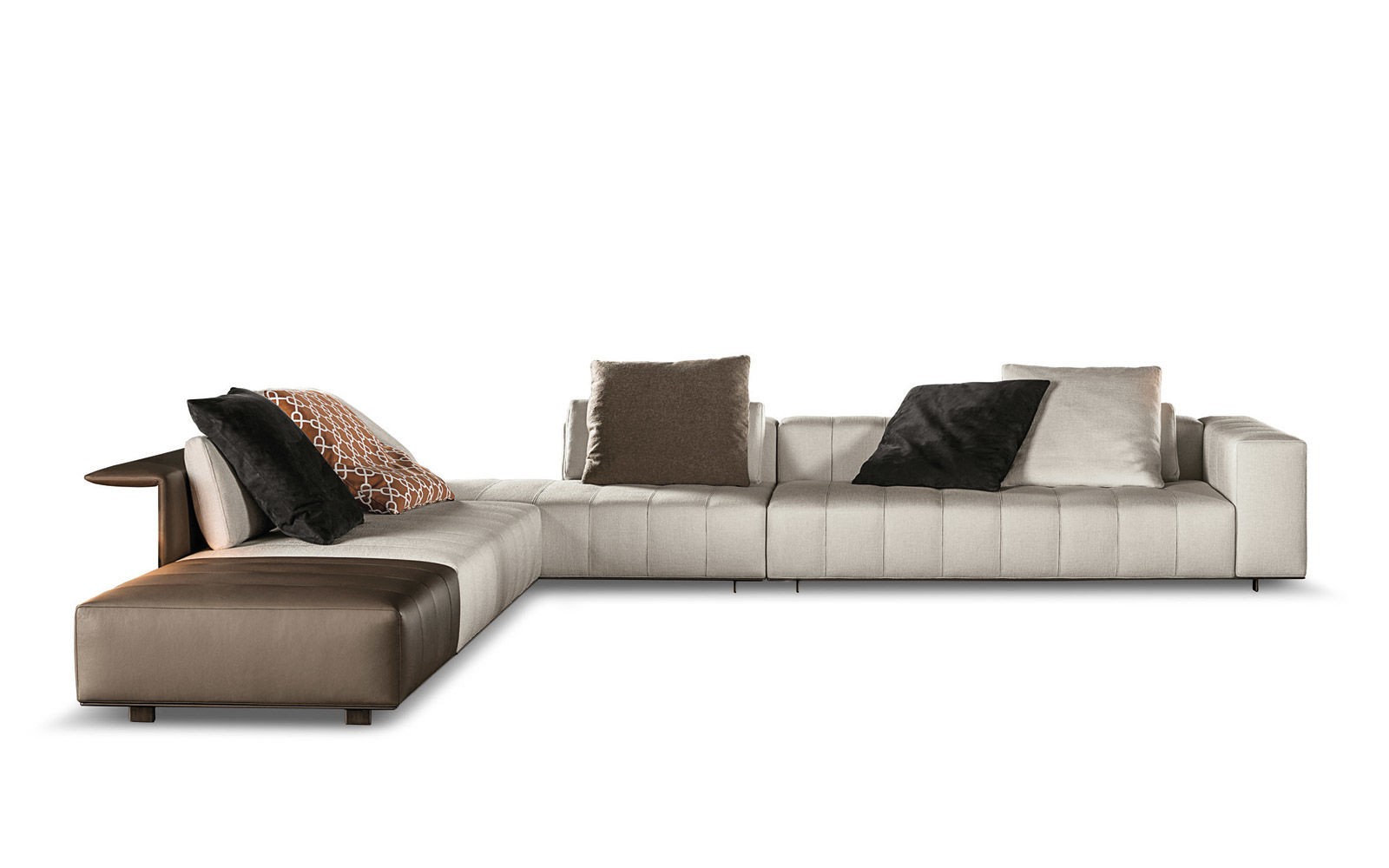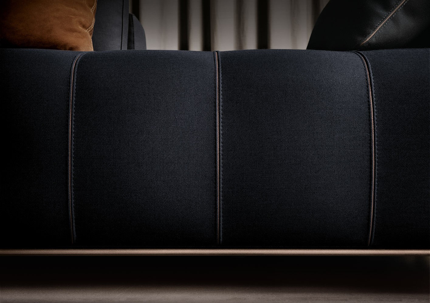 With its highly innovative personality, Interprets the current widespread need to create dynamic, differently accessorized islands of relaxation in which to live more intimately - like for reading and chilling out completely, or more social moments like conversing or spending time with family and friends. This is an orderly clustering of shapes, with one-piece seats decorated with elegant stitching that accentuates its graphic, modern personality. The sophisticated tailoring of the upholstery reveals the company’s expertise in executing extremely complex fine-tailoring techniques. The pieces in fabric are assembled using a strip of eco-leather and double-stitched motif that lend a unique sense of depth.