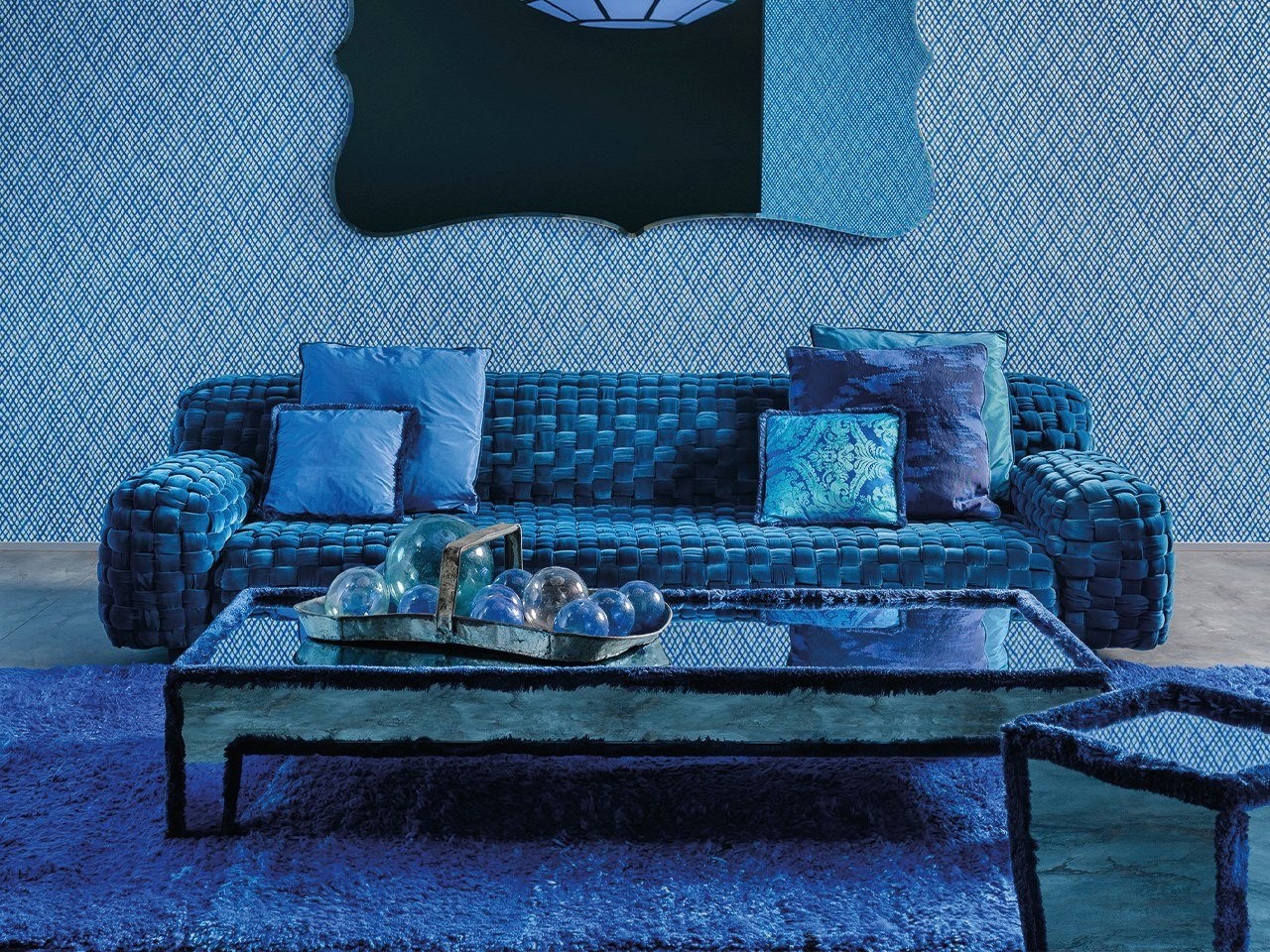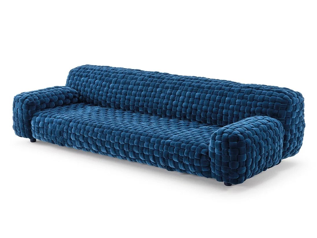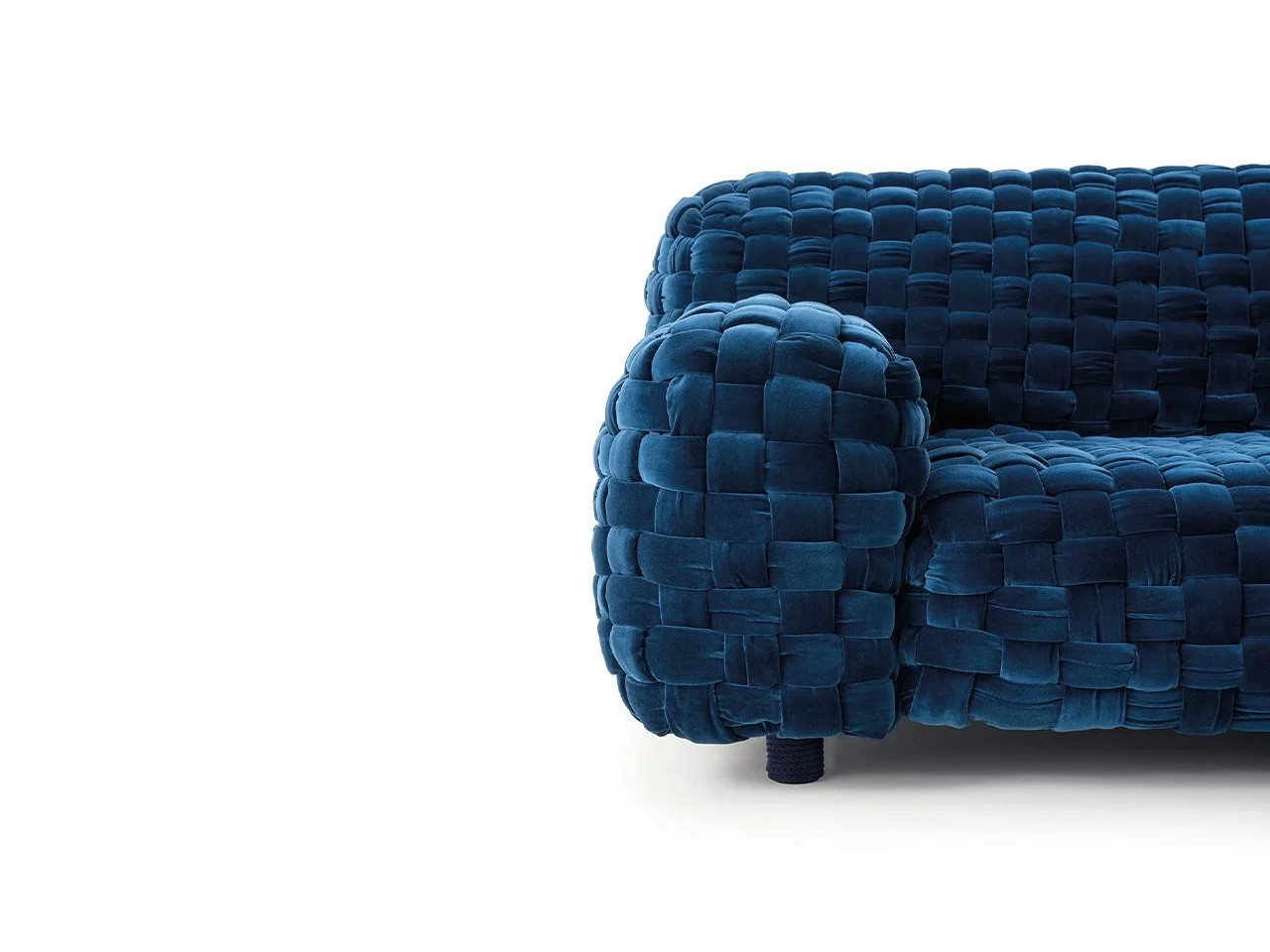 This sofa, while traditional in form, evokes the workings of high fashion with a handmade macro weave in blue velvet. The visual impact is an orthogonal, orderly texture that reveals its softness through the presence of those who use it. The perfection of the Azul sofa lies precisely in its imperfection and in its ability to transform the atmosphere of the space in which it is placed.