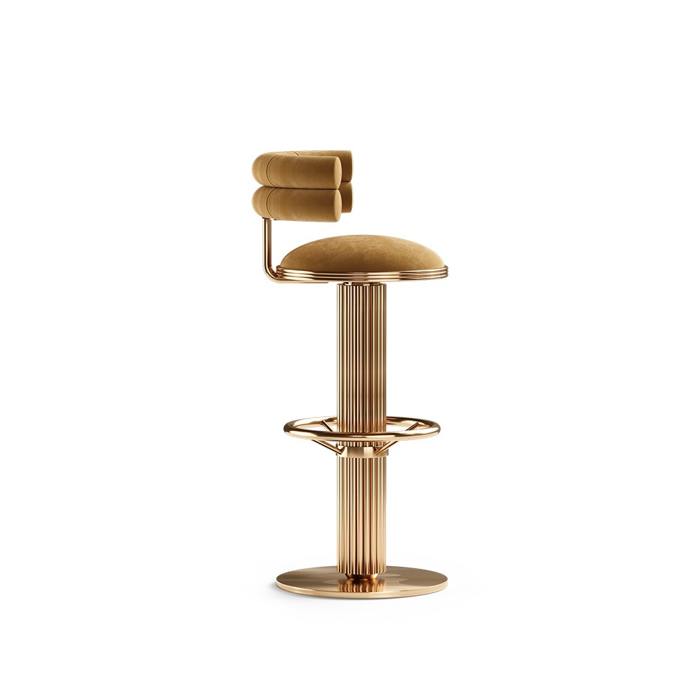 The Mulligan bar chair I has a remarkable design, dazzling for the brass details. The geometric foot, which is covered by an edgy paneling, contrasts with the color of the upholstery. Mulligan's design is a light approach to the mid-century style, bringing to any modern bar or kitchen a fresh look.