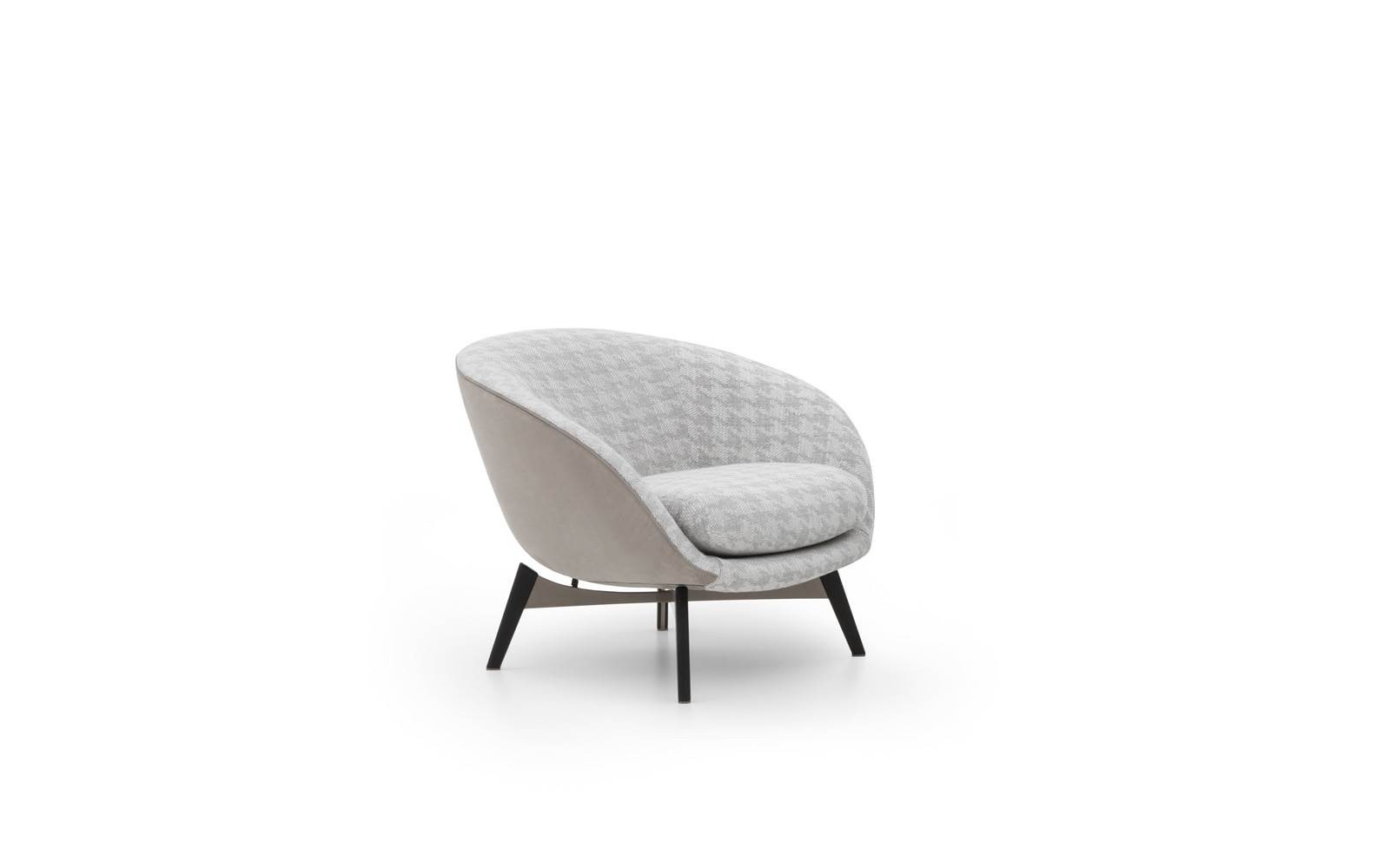 The revolving versions of the armchair,and the lounge and dining chairs are instead characterised by a base made of wooden spokes.