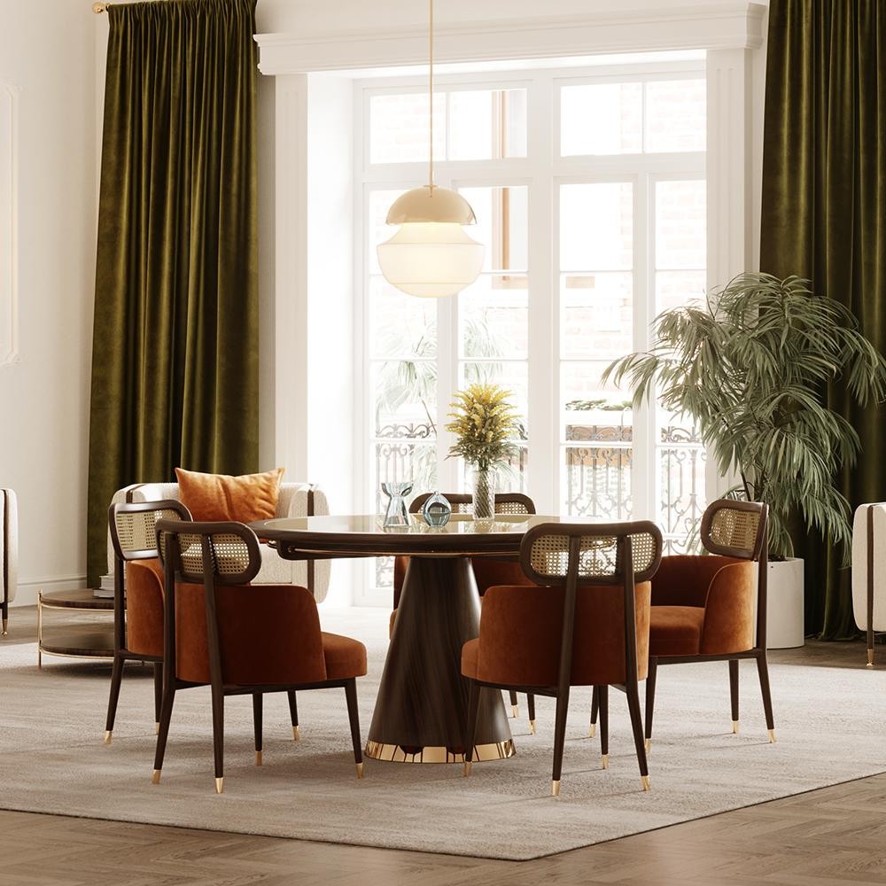 The Carter dining chair has a modern glamorous feel conveyed by the elegant curves. The walnut wood structure embracing the round upholstered element holds the entire design while adding the focal point of the piece, at the top of the backrest, with a rattan component that turns this piece into a more appealing design.