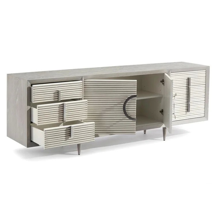 The gray oak sideboard has six drawers and 2 center doors with reeded fronts finished in antique beluga.