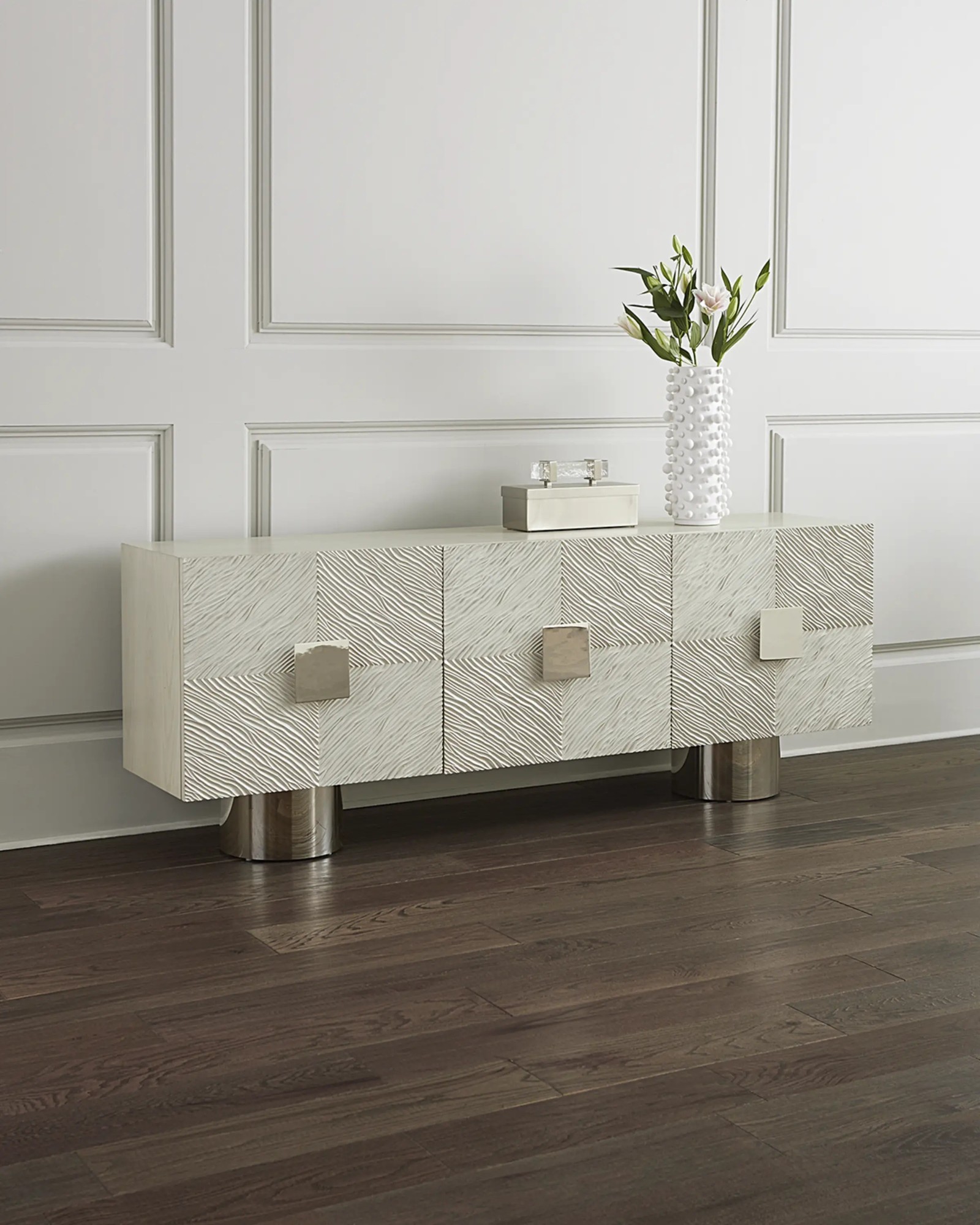Three soft-closed doors with polished stainless steel hardware and circular pedestal base