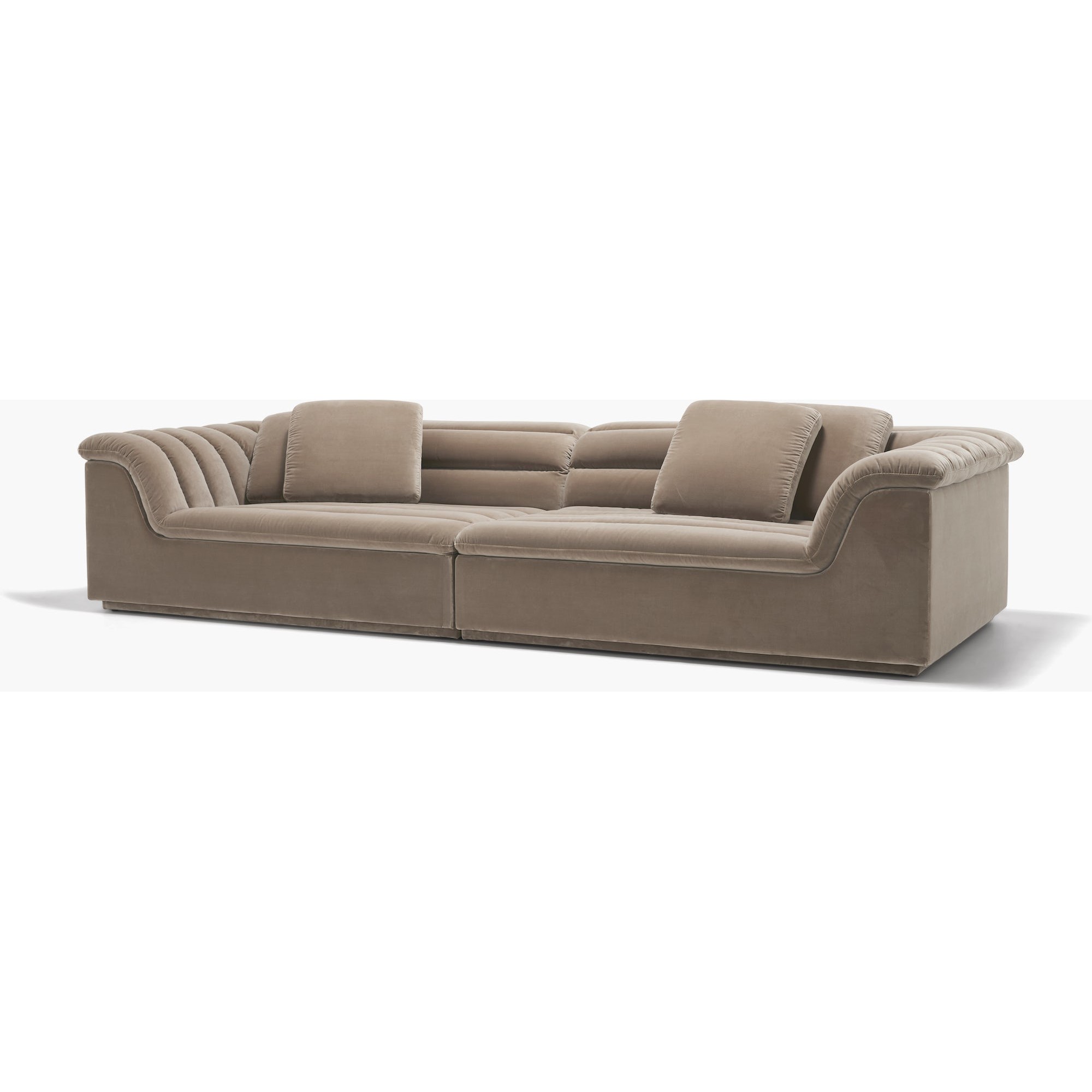 A welcoming, generously sized seating collection with extra-plush channel tufting, deep seats, and wide sloping armrests for comfort from every angle. High-density foam fills the channels for extra cushioning. Float is upholstered in velvet or bouclé fabric, and developed, the rich chocolate brown velvet, specifically for this collection. An ultra-comfortable, laid-back sofa for relaxing and entertaining.
