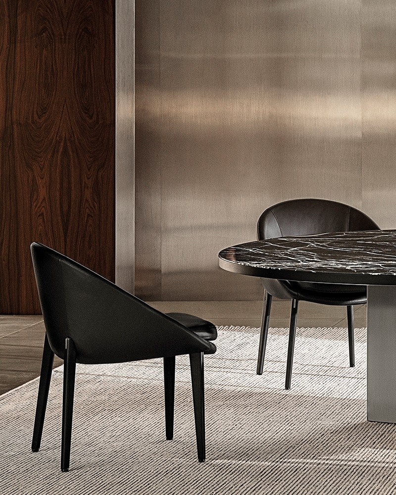 The family also includes dining and lounge chairs - exclusively with wooden legs - and one-size tables that rest on the iconic "x" base in aluminium covered in moka painted ash, with a round or square board, in bianconero marble or in moka brushed ash wood.
