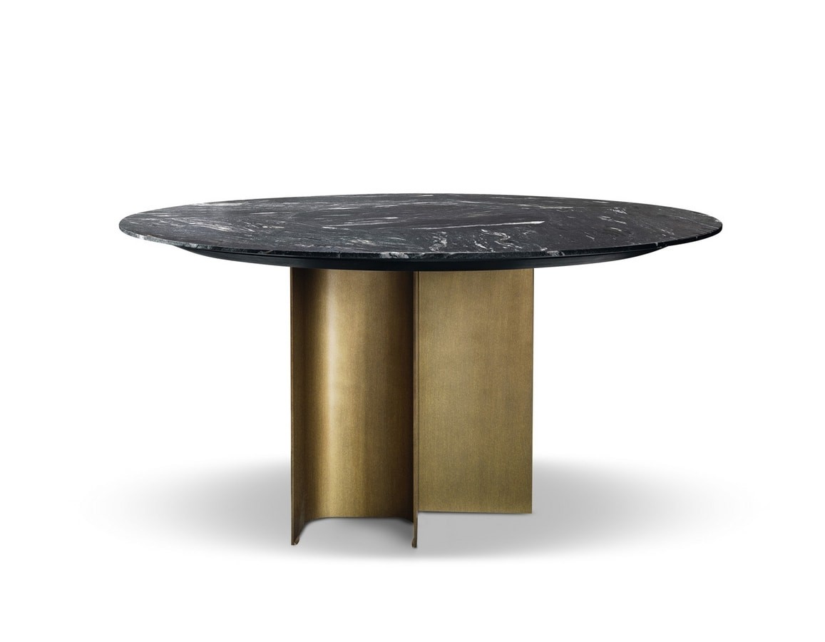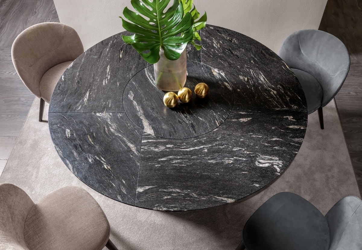 Mirage round table in wood, metal and marble. The base is made up of a curved steel plate. The wooden undertop supports the marble top cut into 5 different sections. You can choose fixed or with integrated Lazy Susan (swivel central top). The top can also be made of wood.
