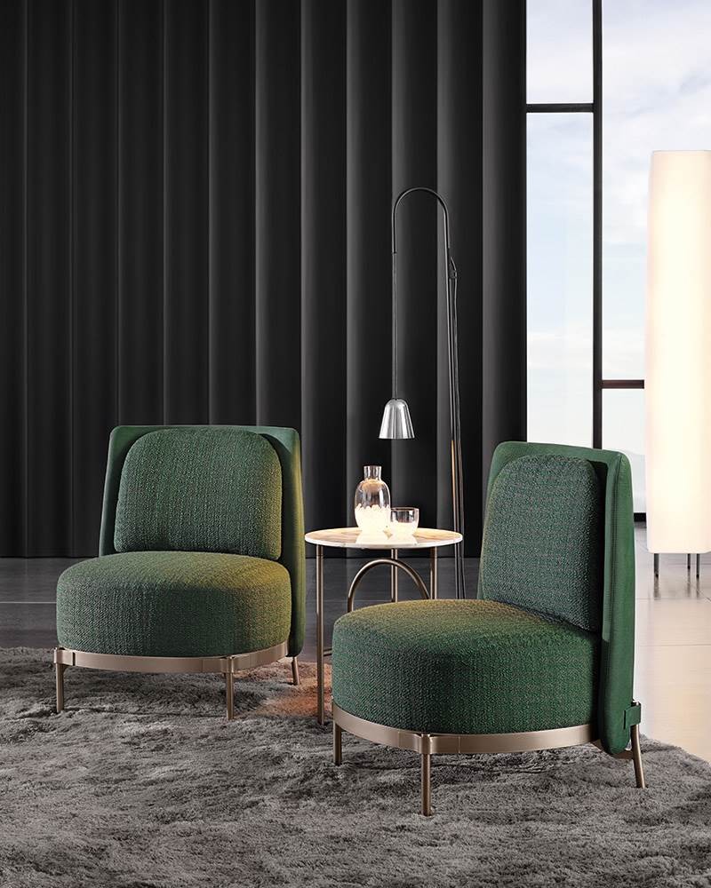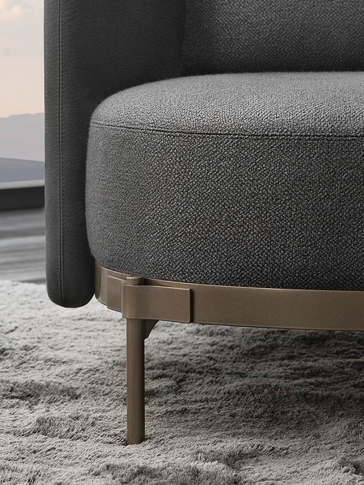 Customizable in a wide range of leather and fabric coverings, it presents two possible sets of pairings. In one version, the fabric covers the back and the seat cushion, while the shell and the tape detail are in leather of the same colour; in the other, the textile envelops the back, the seat cushion and the entire shell, while the tape detail is in Bronze-coloured saddle-hide.