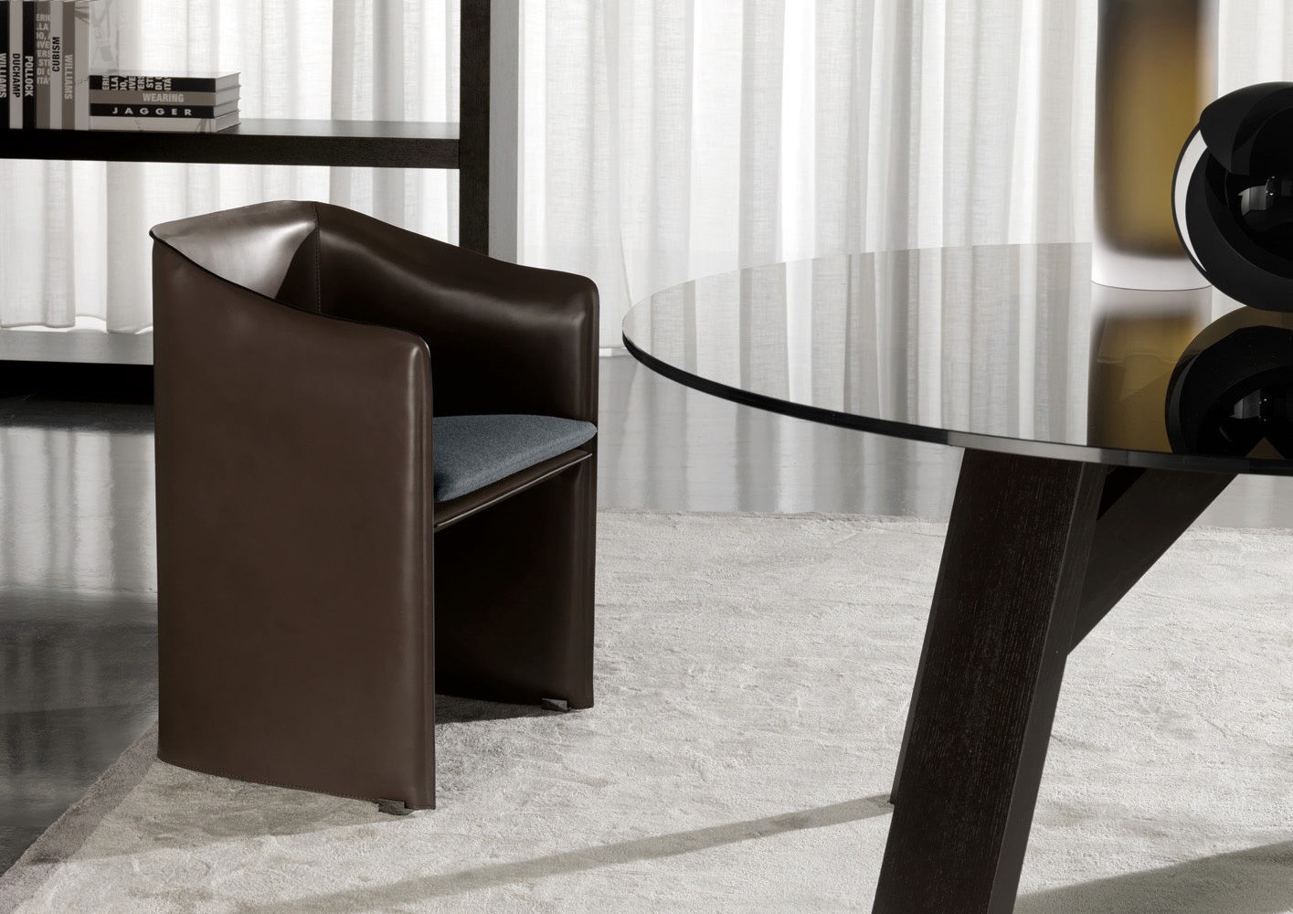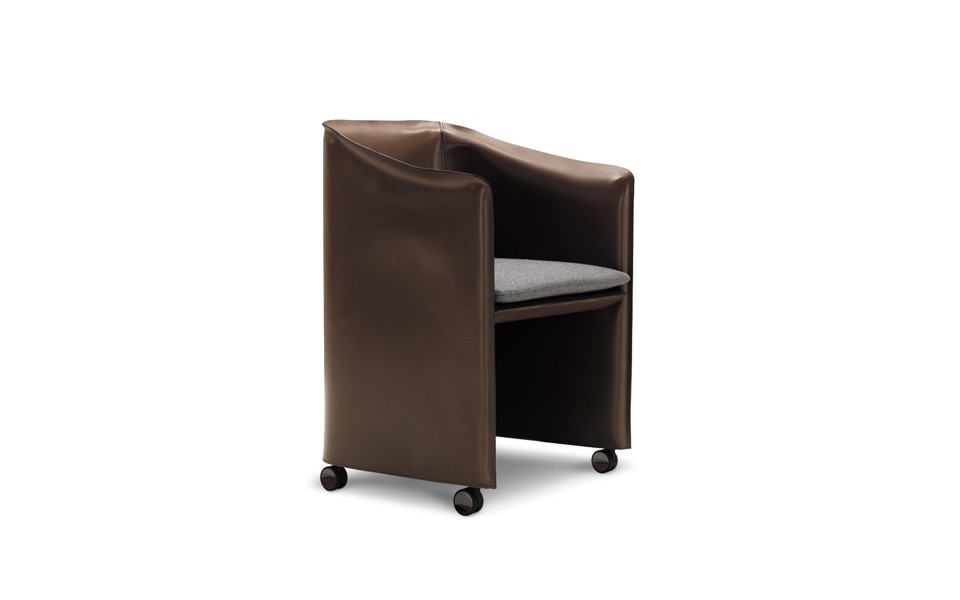 Essential lines and small proportions that expresses its sophisticated elegance through the use of a noble material such as leather, combined with the fabrics of the exclusive textile collection. A seat that finds its natural evolution in the case roller, a piece with pivot wheels coated in soft anti-scratch rubber.