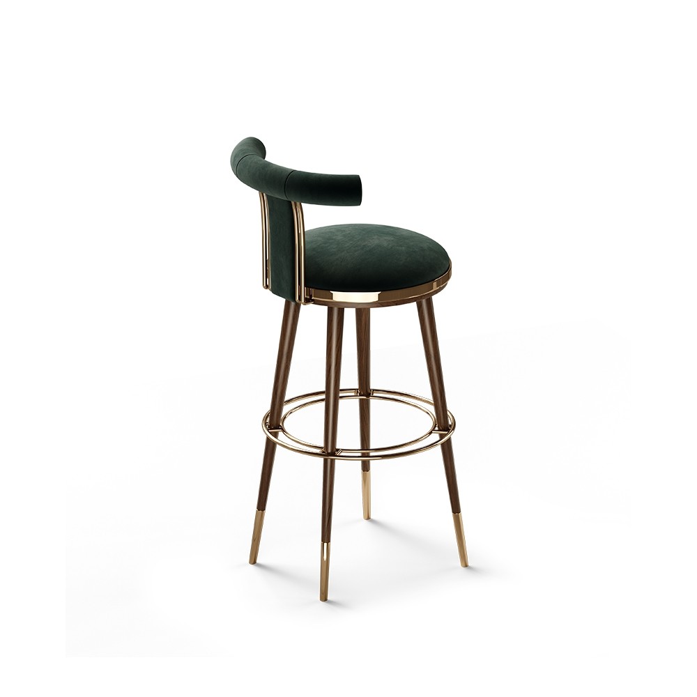 The sculptured Morris bar chair is supported by tapered tall framed legs, finished by lacquered walnut wood. All this vintage refinement is accomplished through all the polished brass details from the bottom to the top and finely upholstered with a soft fabric.