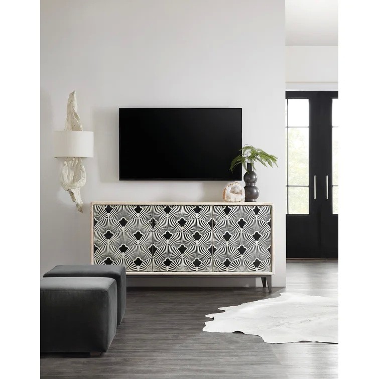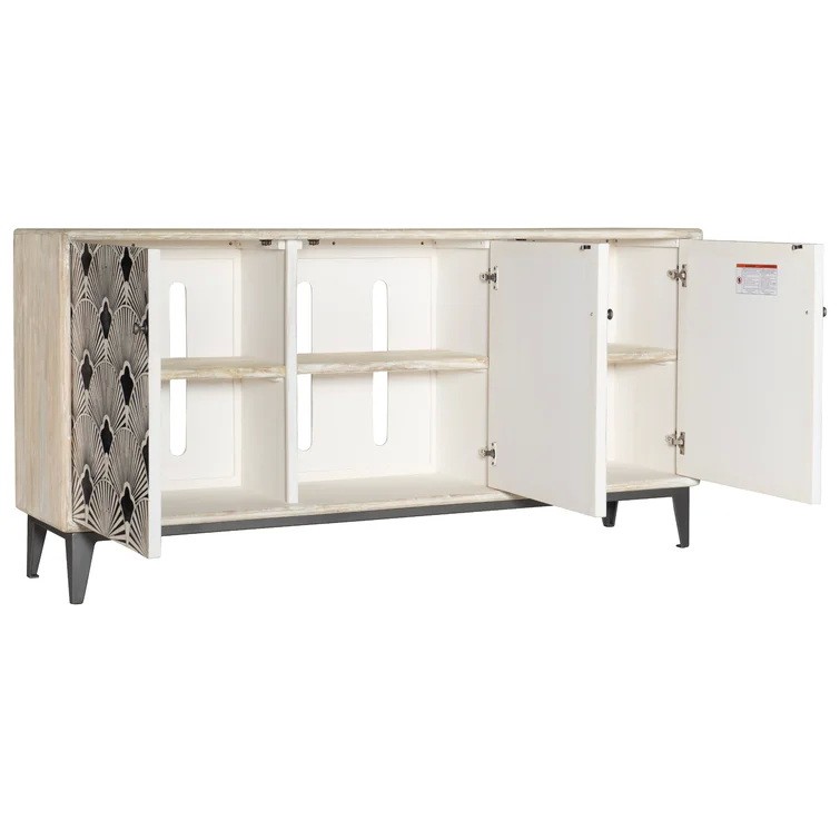 Contemporary and chic, this entertainment center combines natural materials and a classic black and white color scheme and shell motif to create a functional focal point. Crafted of Mango Wood with bone inlay, a natural wood finish on the outside of the case contrasts with black and white inlay on the door fronts and is complemented by a gray metal base and hardware and an off-white painted interior. There’s one removable shelf behind each door, a 3-plug electrical outlet, ventilated back panel and soft-close hinges on the doors.