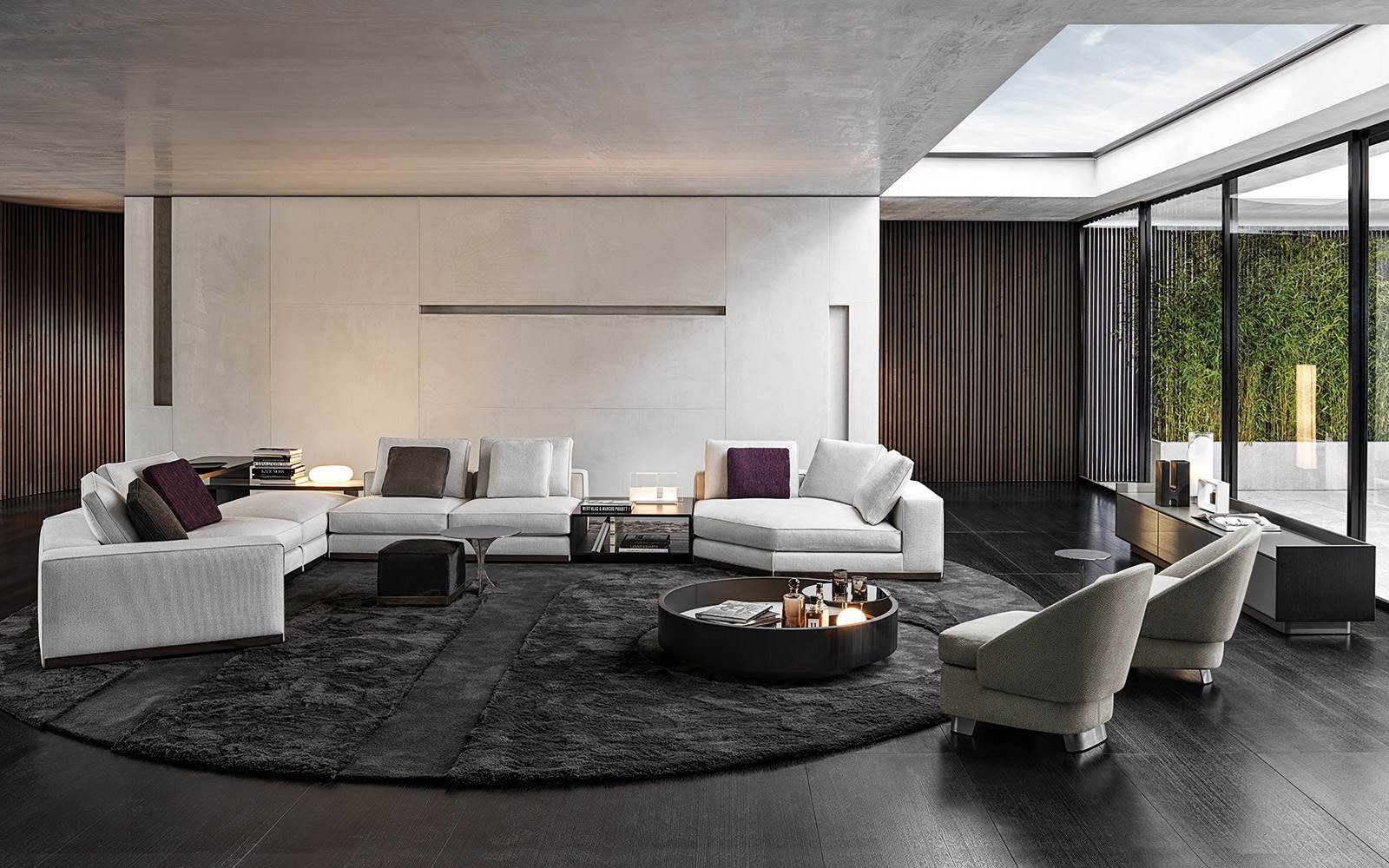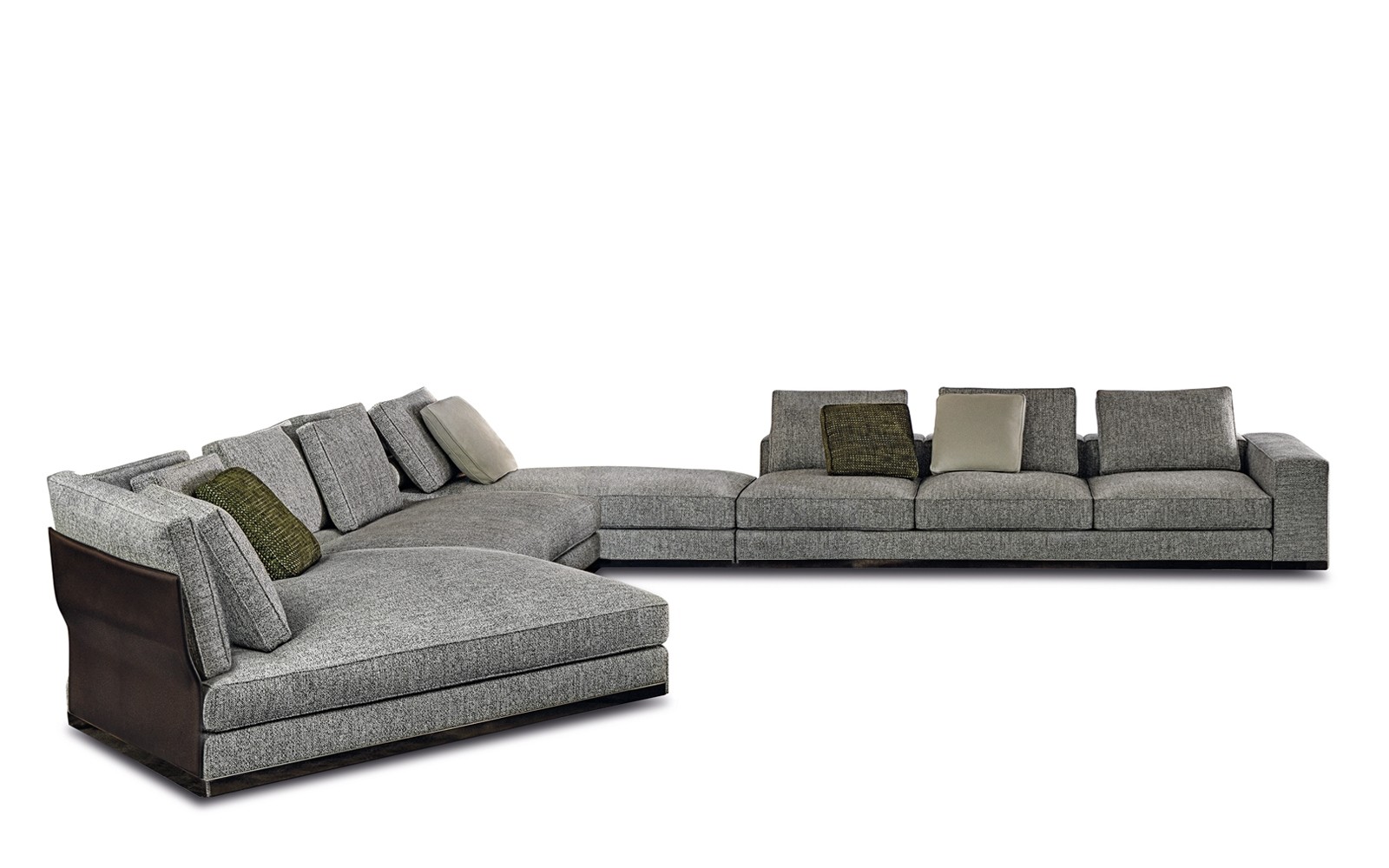 Every element of the system is made with exquisite goose down padding to ensure maximum comfort, features cushions finished with a piping that defines their profile and a distinctive aluminium strip, slightly rounded at the edges which skims the floor, in a brand new polished Brandy colour finish.