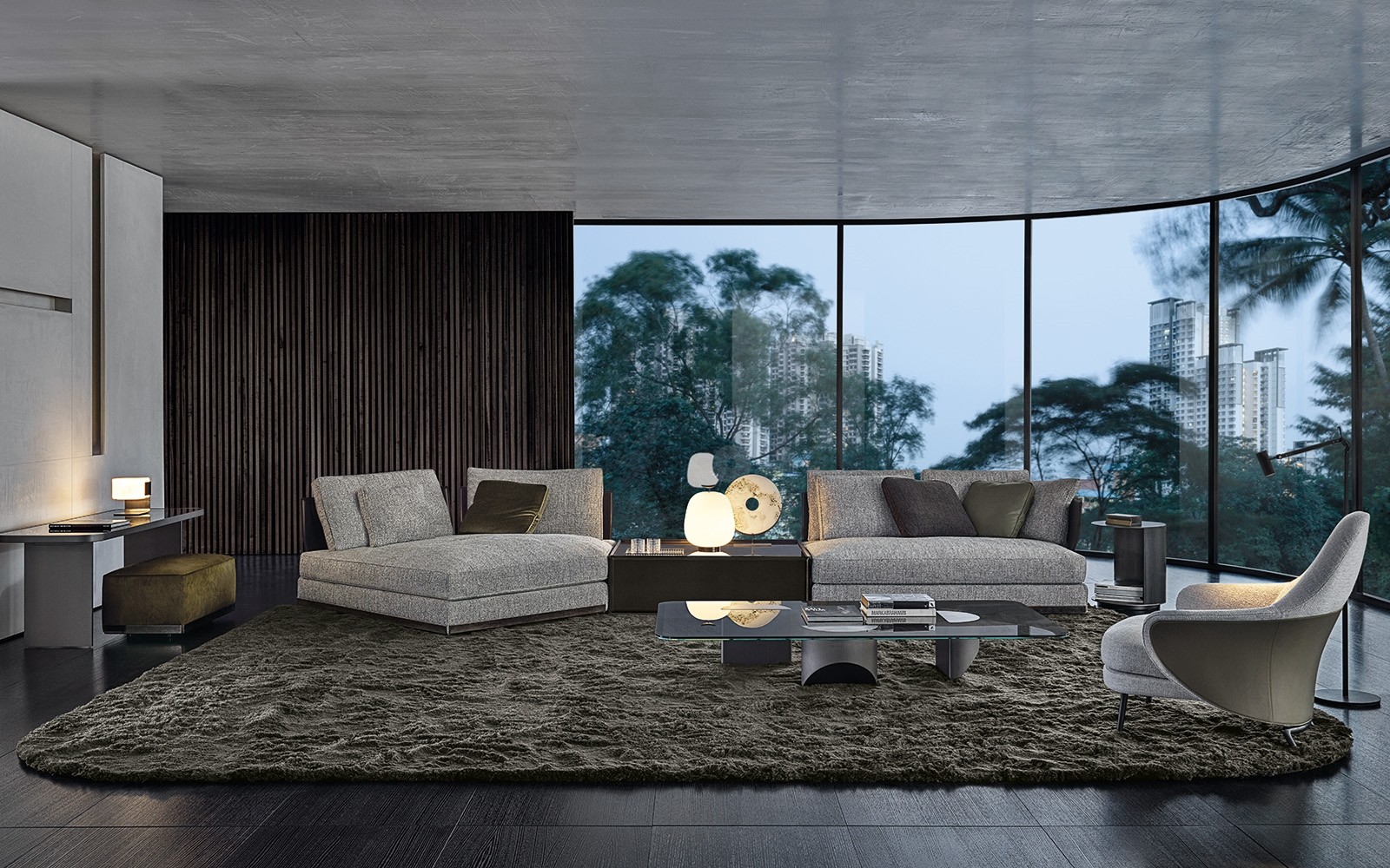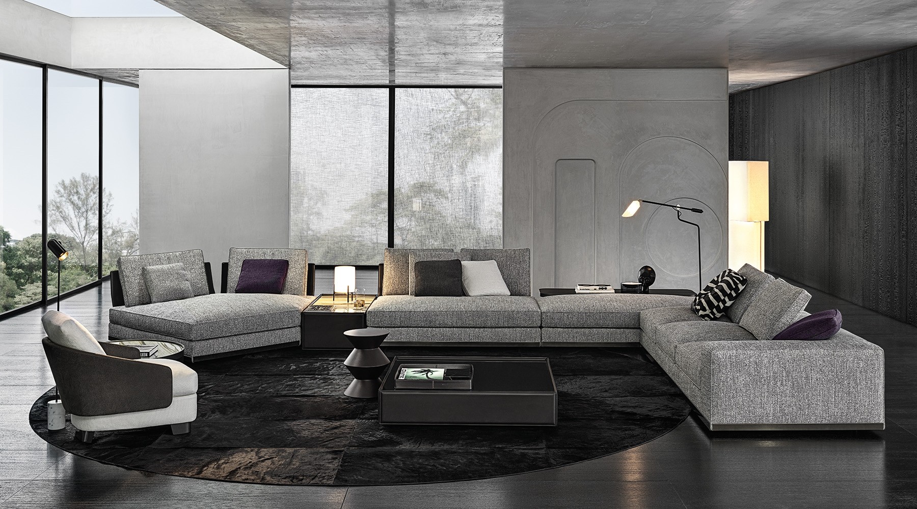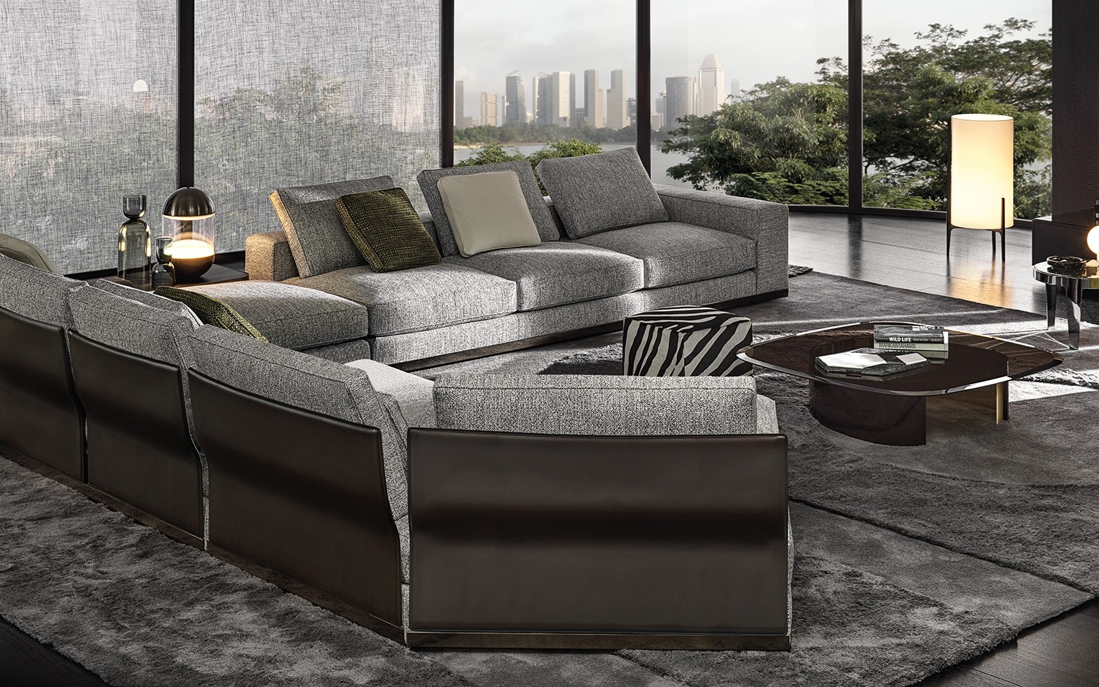 Sofa leaves plenty of room for interesting compositional possibilities: it enters a harmonious dialogue in terms of both colour and shape with the Amber coffee tables, is complemented by the Side coffee tables, with their frame in saddle hide that evokes that of the backrest and enhanced by the Clive consoles, which play around with surfaces, even setting one over another.