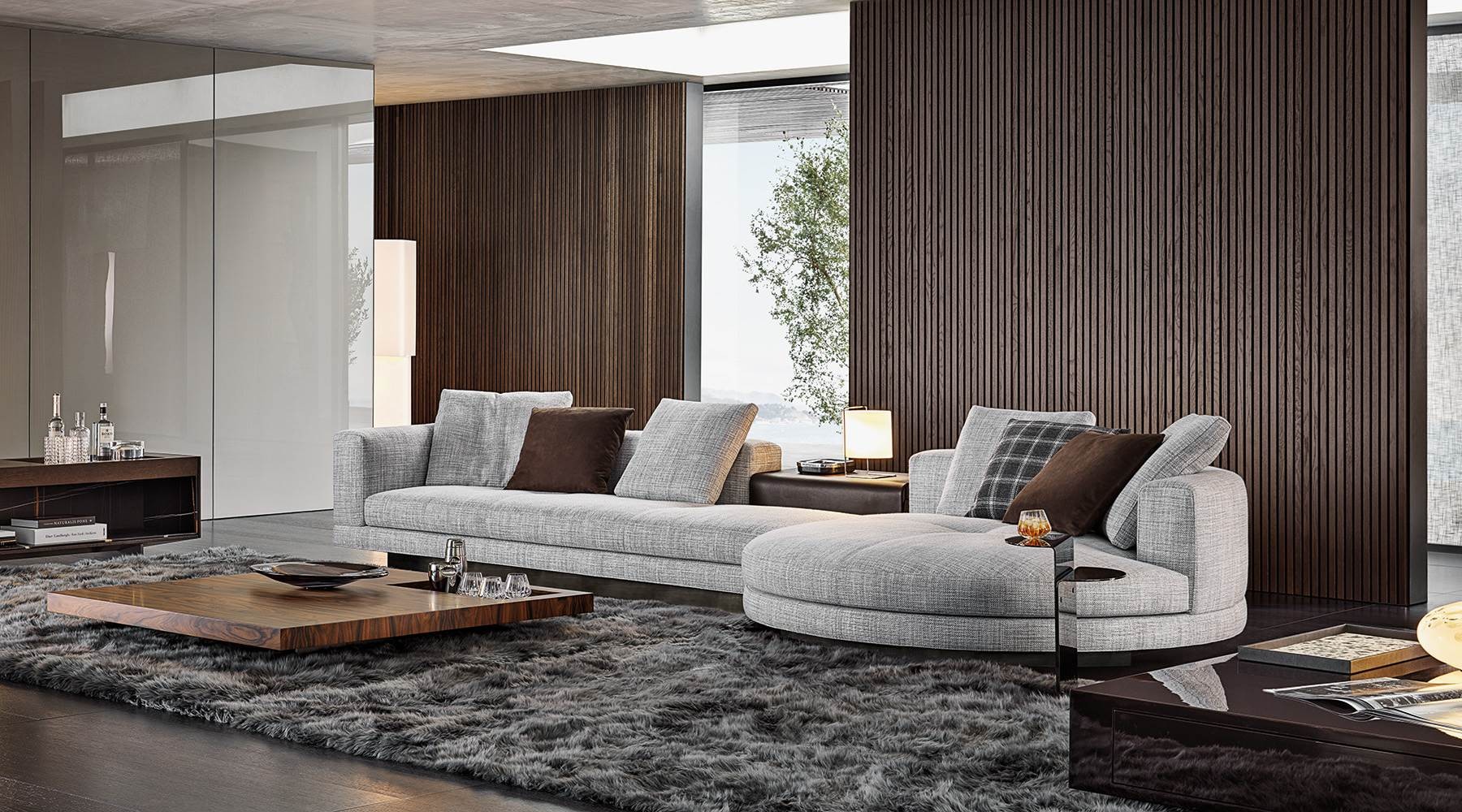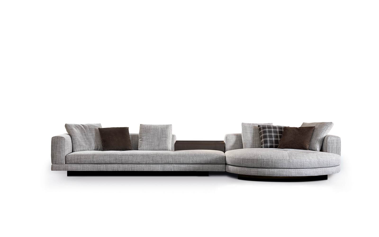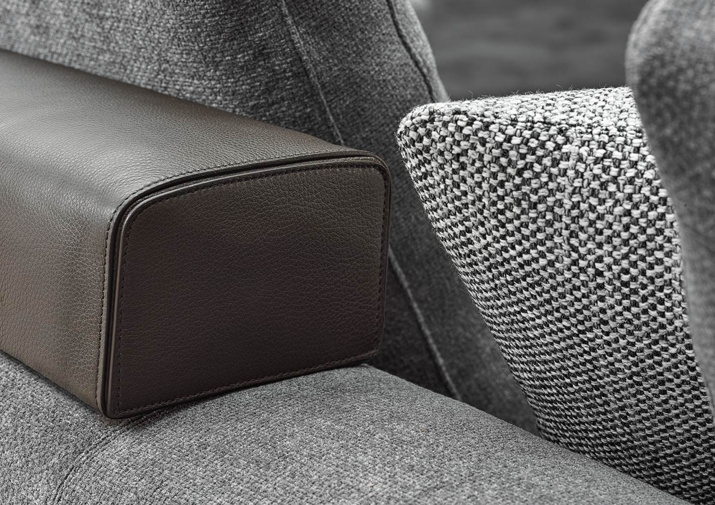 As well as the fabric covering, the padded structural base can also feature a covering with strips of leather, crafted with the same technique used in fine leather luggage-crafting. References to the concept of high-end leather goods are also found in the headrests and the elegant “C”-shaped Flap surfaces, which seamlessly blend into the seating elements, animating the compositions with a vibrant rhythm.