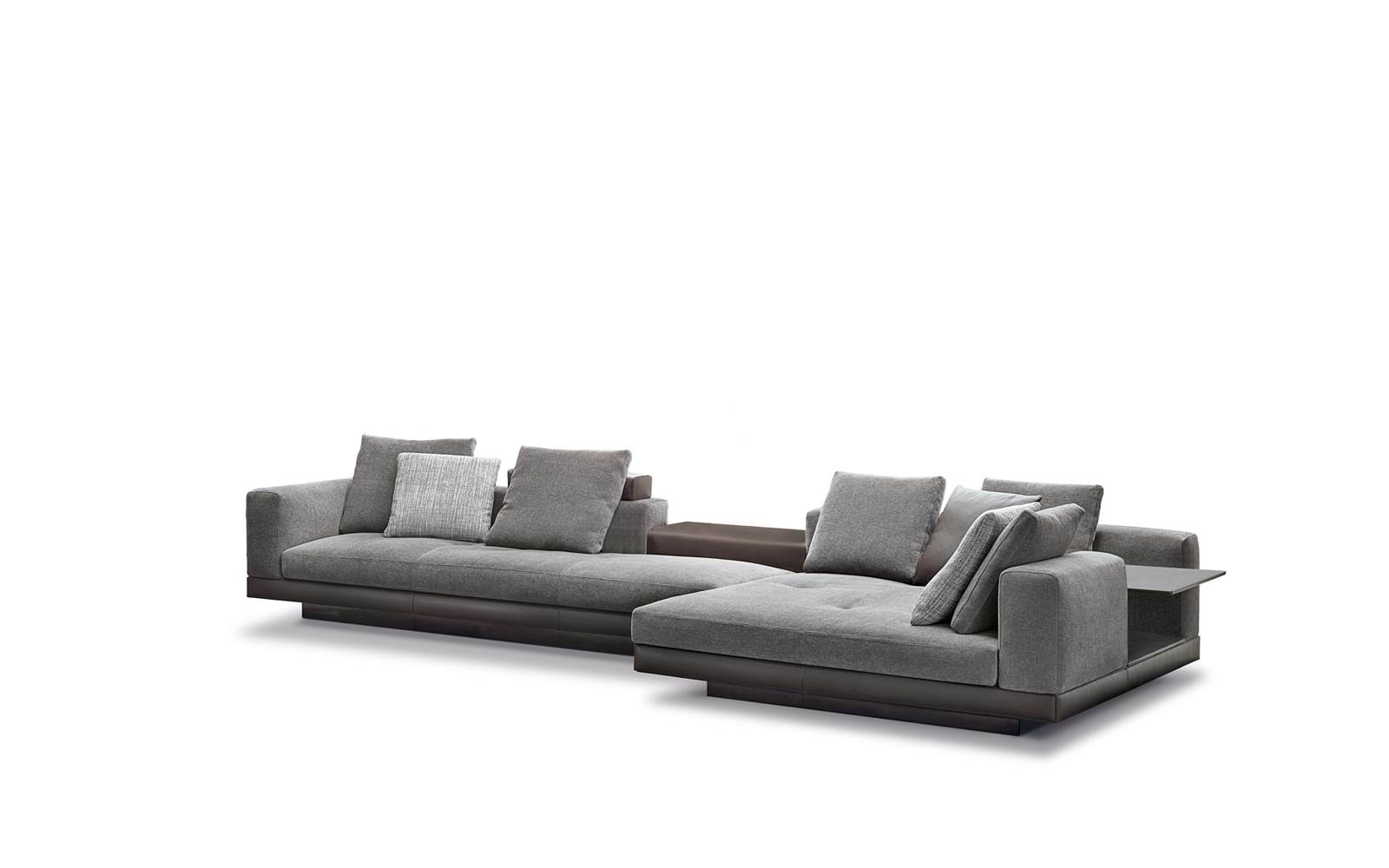 The structural base is raised from the ground on thin blades in extruded aluminium in a Brandy polished varnished finish, positioned at the front, giving the sofa an appealing and airy look, and recalling the metal parts of trunks and suitcases.