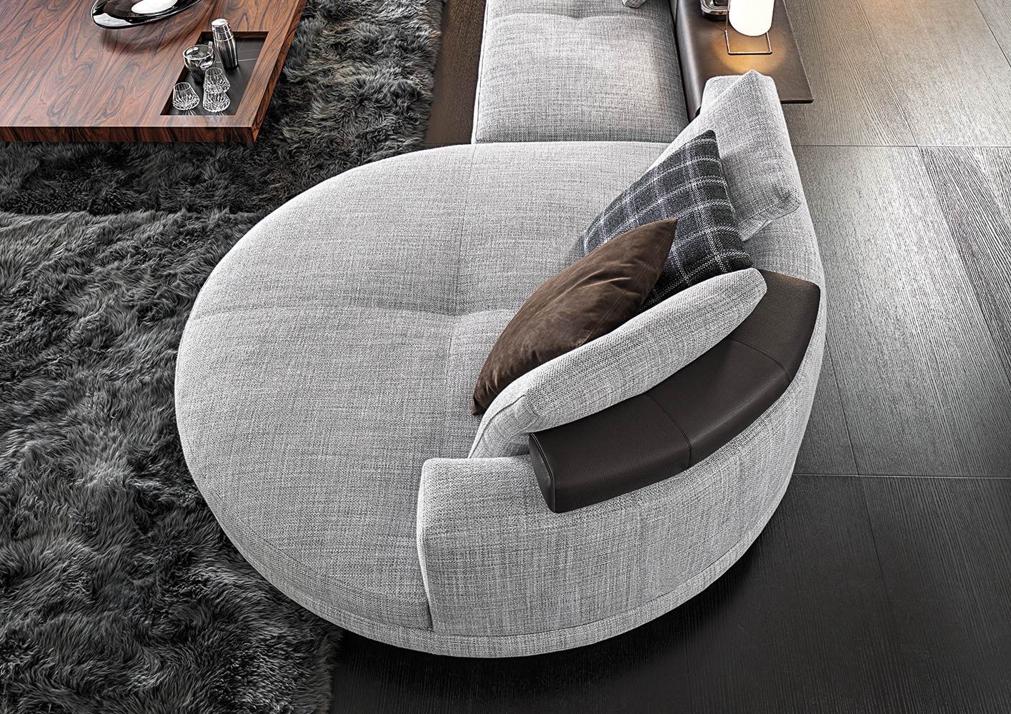 The well-structured, customisable range, offering many different compositional options, in addition to longer square chaise-longues, also includes circular elements, which can be positioned near the sofa as atolls.