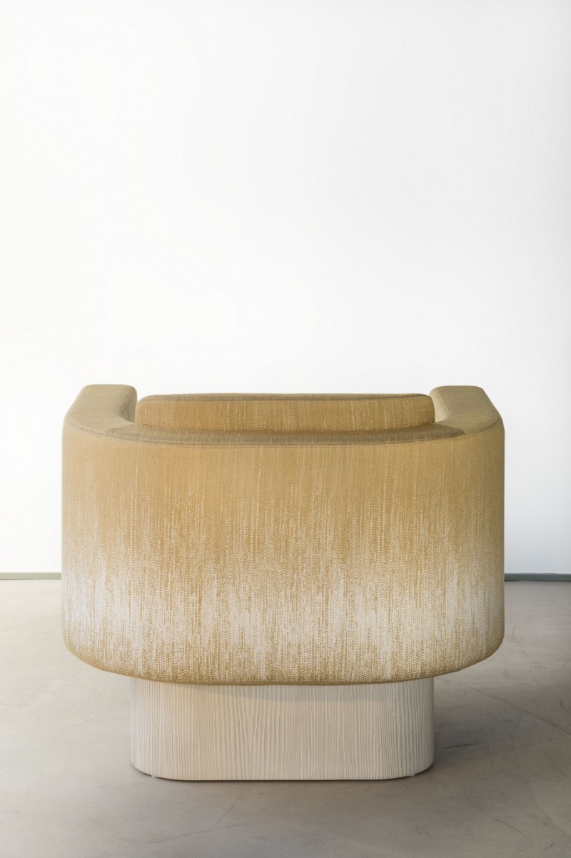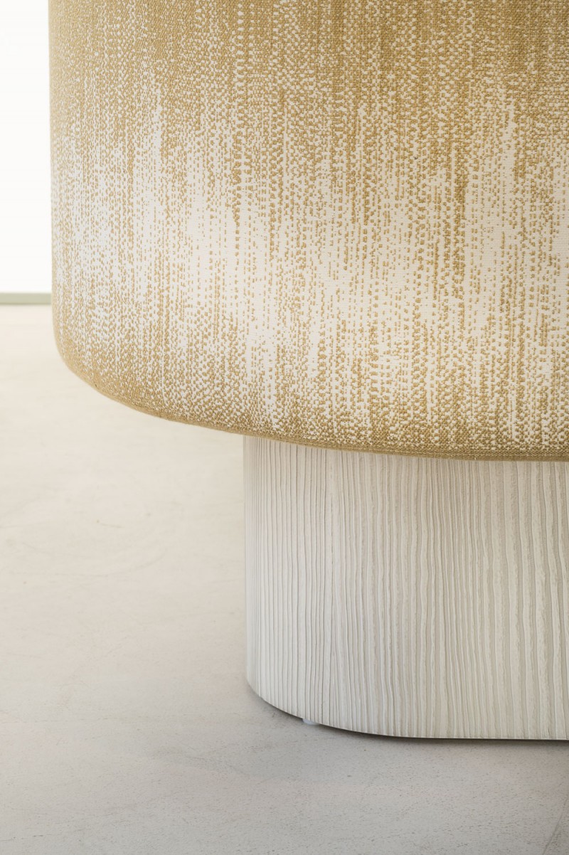 With its opulent forms, its obvious sense of comfort, our Nashville armchair, which elegantly combines the square and the curve, structure and softness, sits on a base-pedestal in brushed pine. The vertical streaks of light wood match the irregular ones of its upholstery, a superb jacquard that combines several shades of pale gold, as if weathered by time and the sun. In this coat of light, this armchair could appear in an Elvis biopic, where it would furnish the office of a flamboyant producer: it is the most glamorous of the collection!