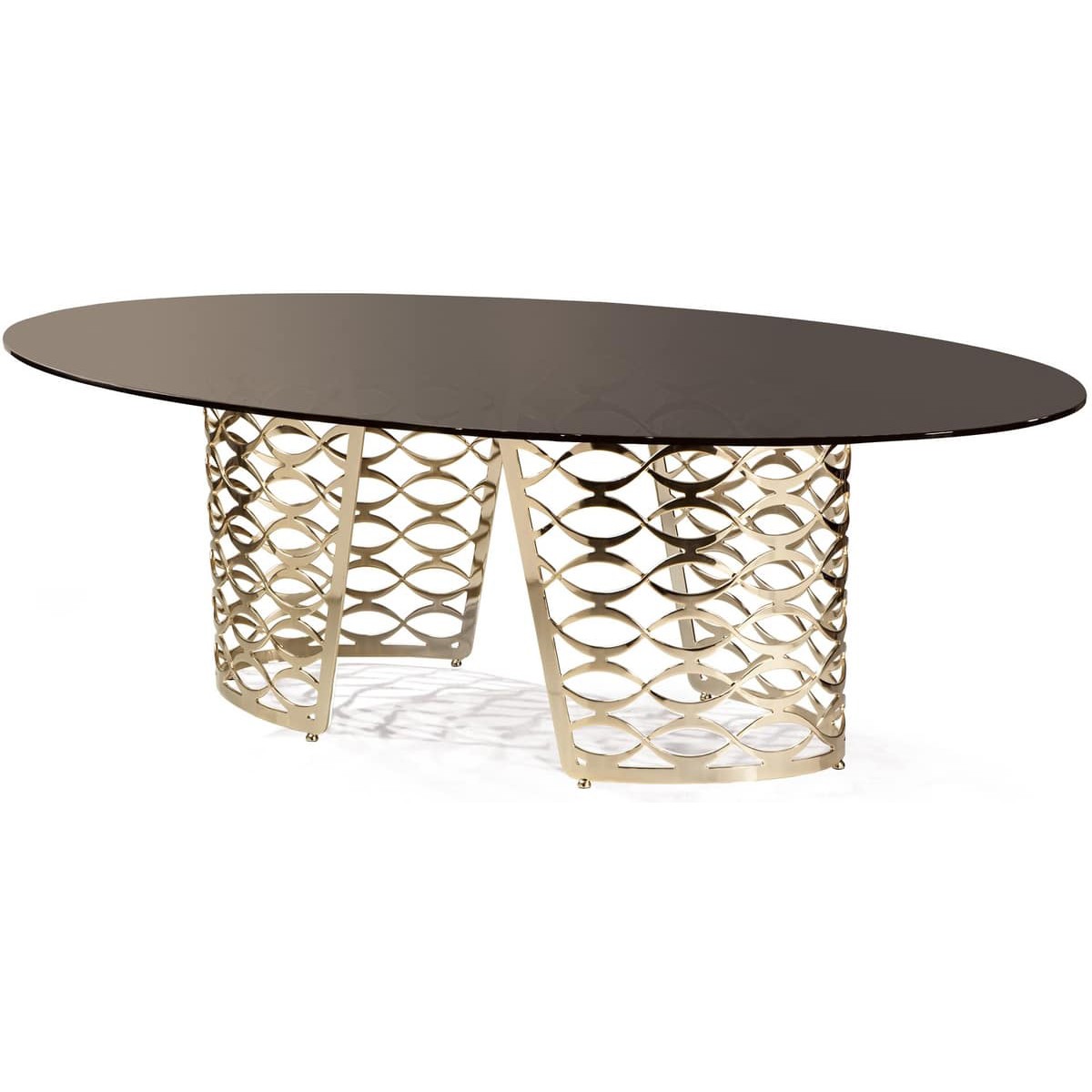 Modern table made of glass or marble with oval top and worked metal base. Top available in marble or glass; the laser-cut steel plate base is milled and bent to form a three-dimentional pattern; golden and bronzed finish or leaf-work decoration create a strong visual impact.