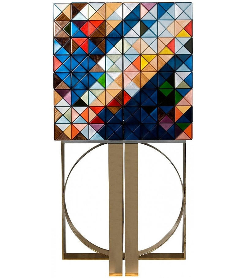 Pixel designed by Boca Do Lobo is a beautiful cabinet composed by 1088 wooden triangles in a diversity of woods and finishes: silver leaf, gold leaf, colored lacquers, and ten different types of wood leaf (ebony veneer, African walnut veneer, zebrano veneer, poplar veneer, palisander. Interior: two doors finished on the inside in a diamond quilted blue silk fabric open to nine drawers with gold knobs and a cabinet space all finished in aged mirror. Base: polished brass.