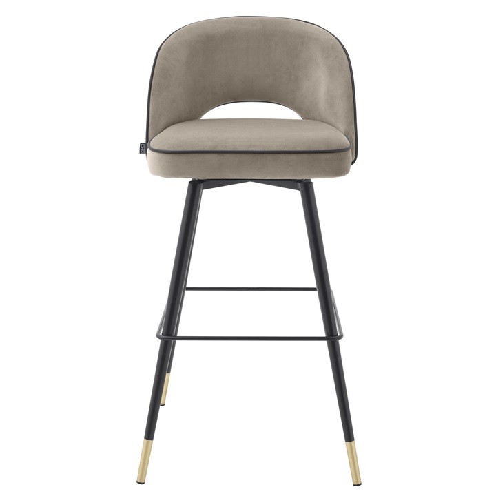Create a wow-worthy interior with the Cliff Bar Stool in Savona greige velvet, that comes in a set of 2. Featuring black tapered legs with gold caps, the solid frame holds an armless back that is open at the bottom before the seat. Its stylish silhouette is accentuated with black faux leather piping. MR-CLIF-BAR-001-001
