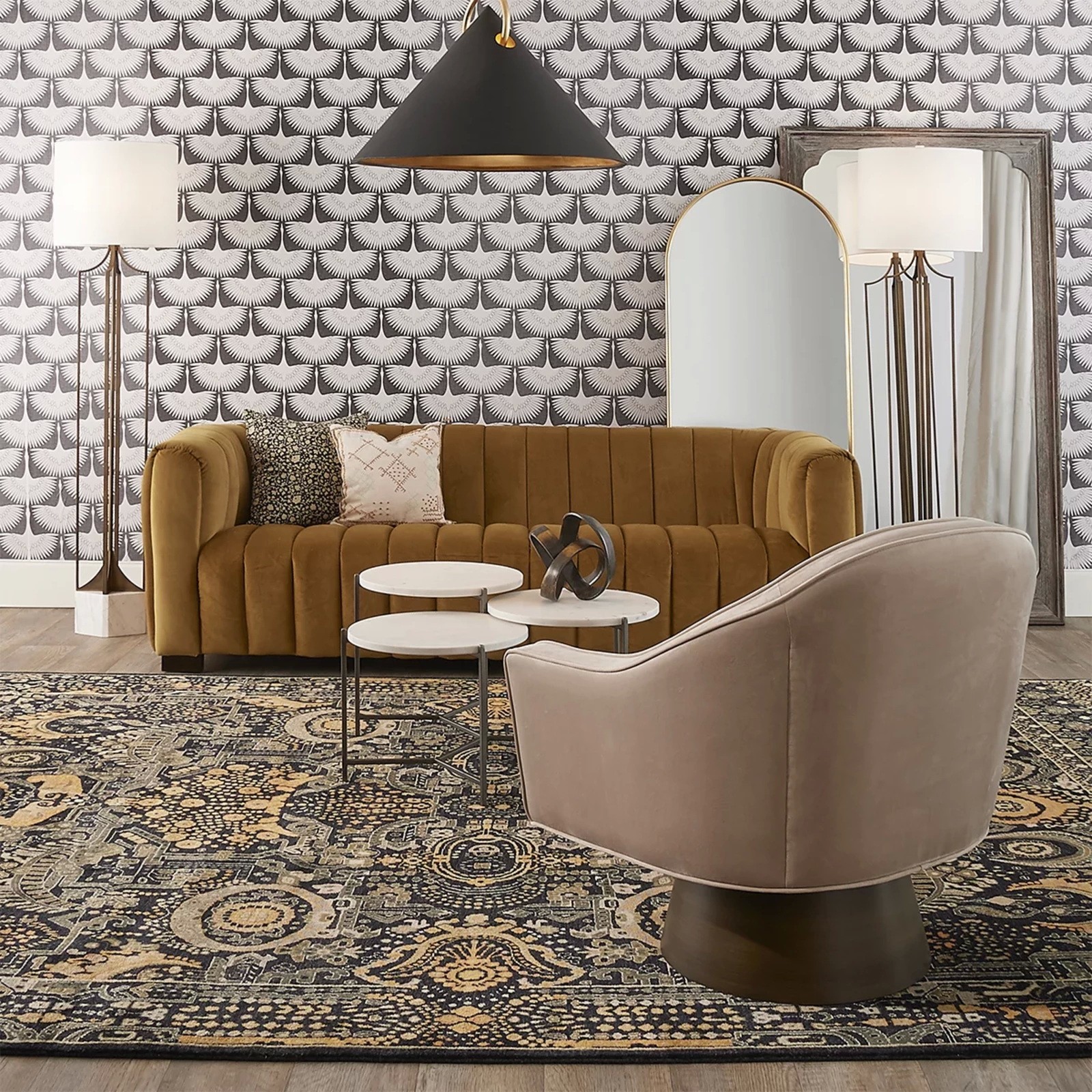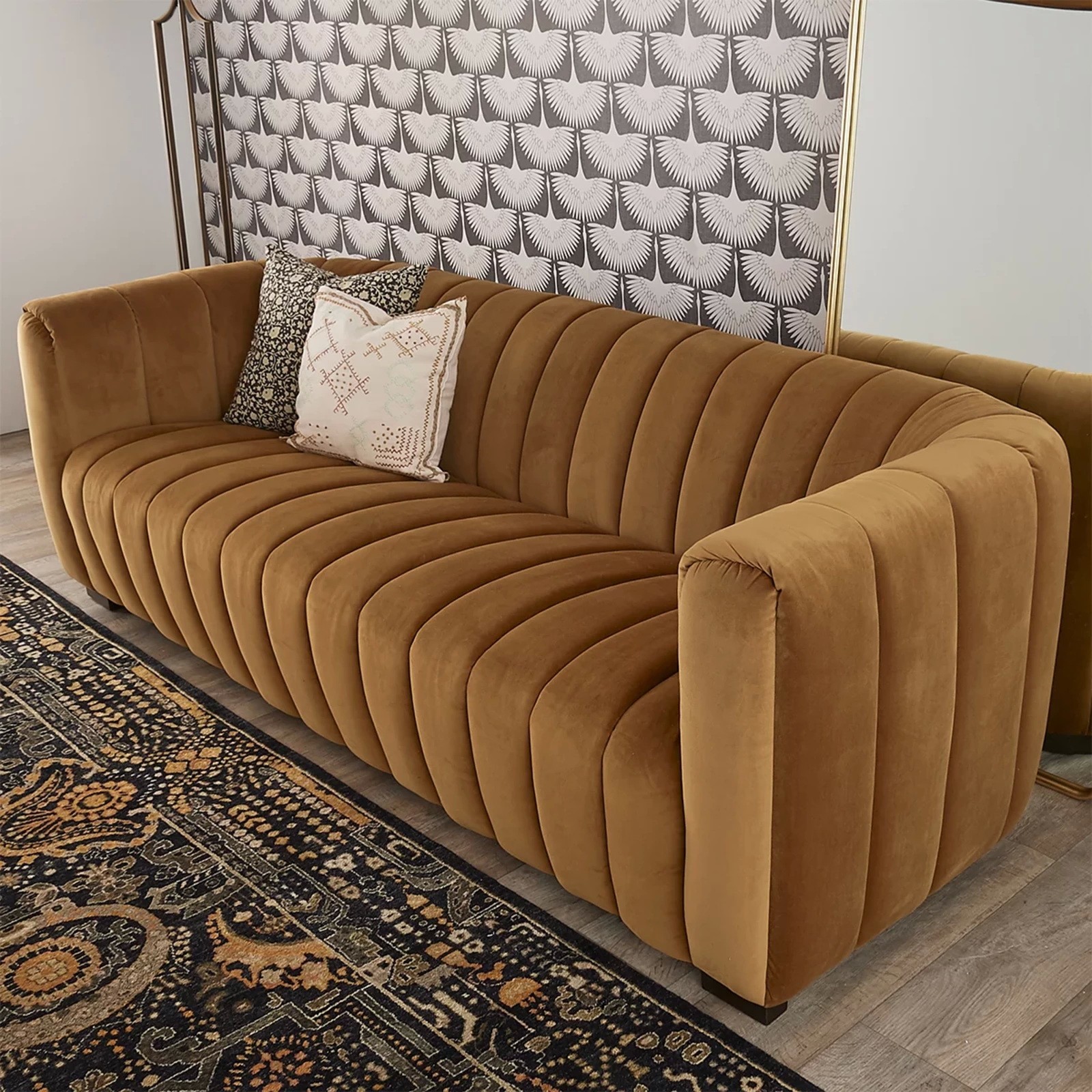 This luxurious and glamorous sofa is an eye-catcher in a modern, eclectic, boho or contemporary room. The opulent interior exudes soft luxury in a rich palette that offers a standout twist on neutral tones.