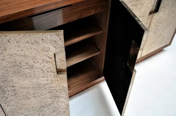Cabinet in hammered bronze and walnut. Beautiful cabinet in luxurious Claro Walnut and hand hammered bronze doors.